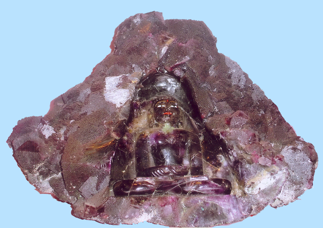 A beautiful orchid shaded "darshaniya" Tirthankar statue in the softest gemstone, Fluorite. The deity is seated in deep tranquility amidst rough rocks. The body is proportionately carved in perfect Padmasan posture. The face is highlighted with accents of color and adds to the divine statue’s beauty.