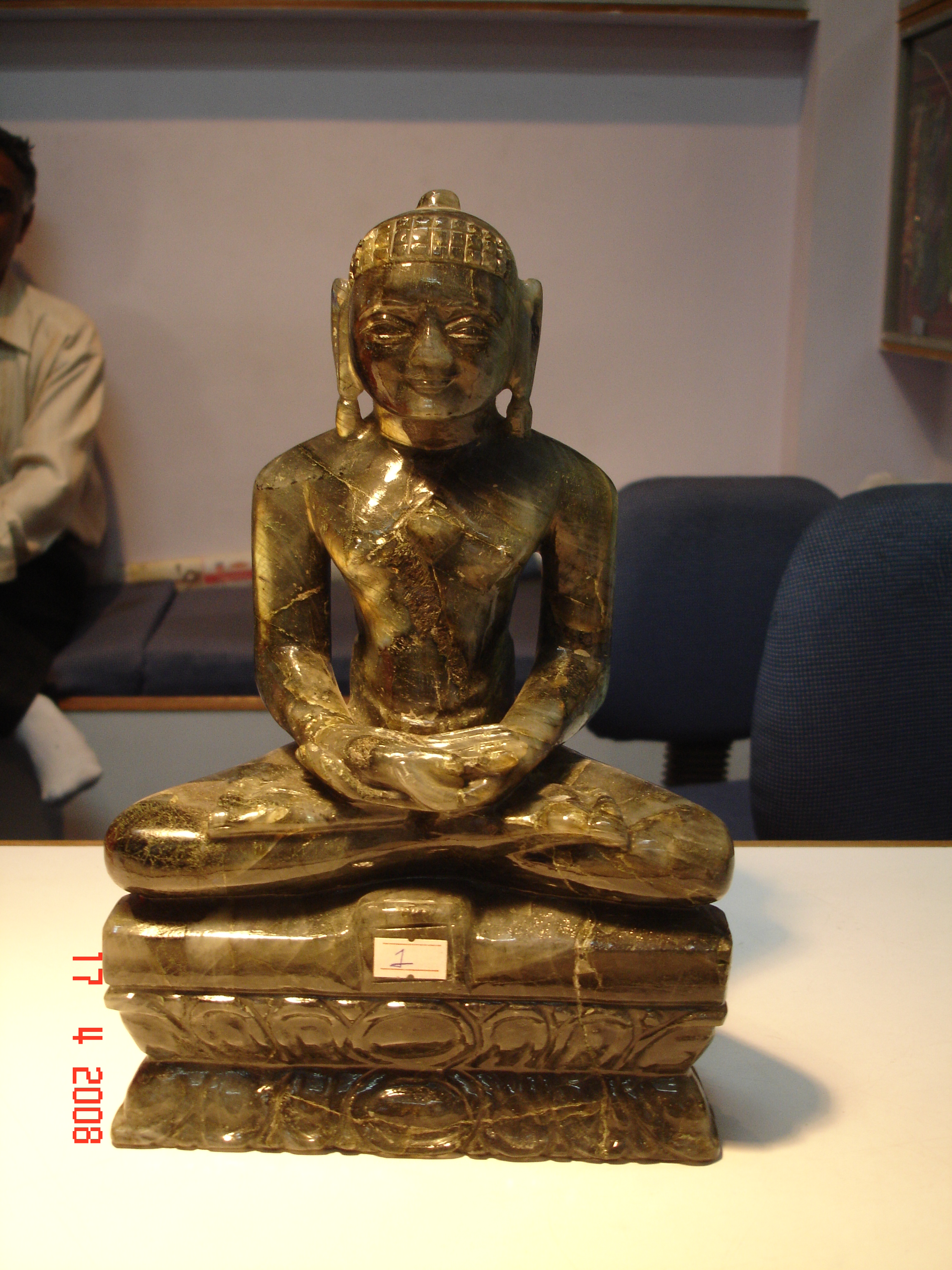 A double lotus "Sinhasan" platform highlights this gorgeous labradorite beauty in grey. Hands and legs are folded in prayer. The face is calm and serene and appears to be in deep meditation.