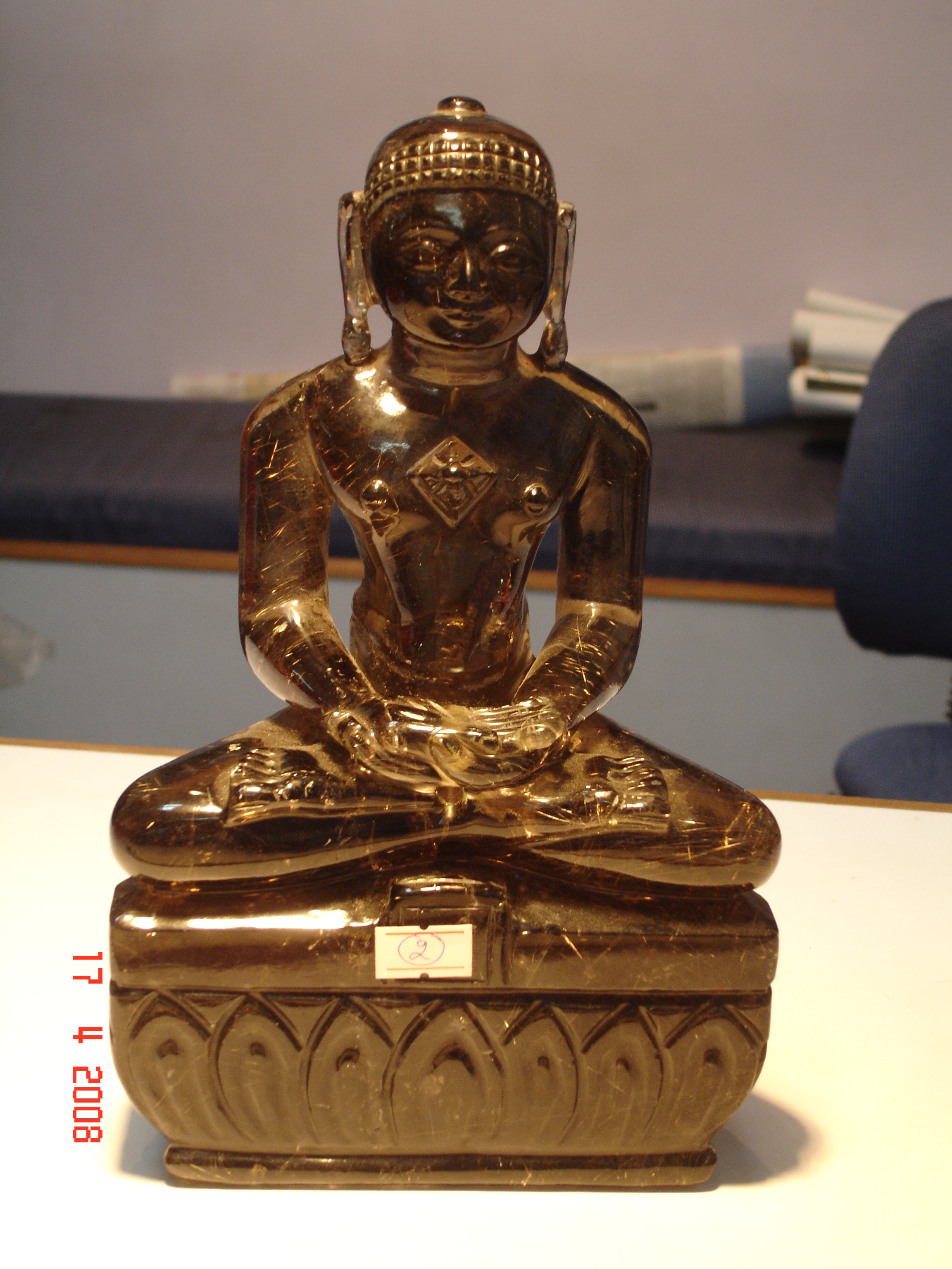 A grey gold gorgeous Tirthankar statue in Rutile. The "Srivatsa "symbol on the chest is very prominent and adds to its aesthetic.