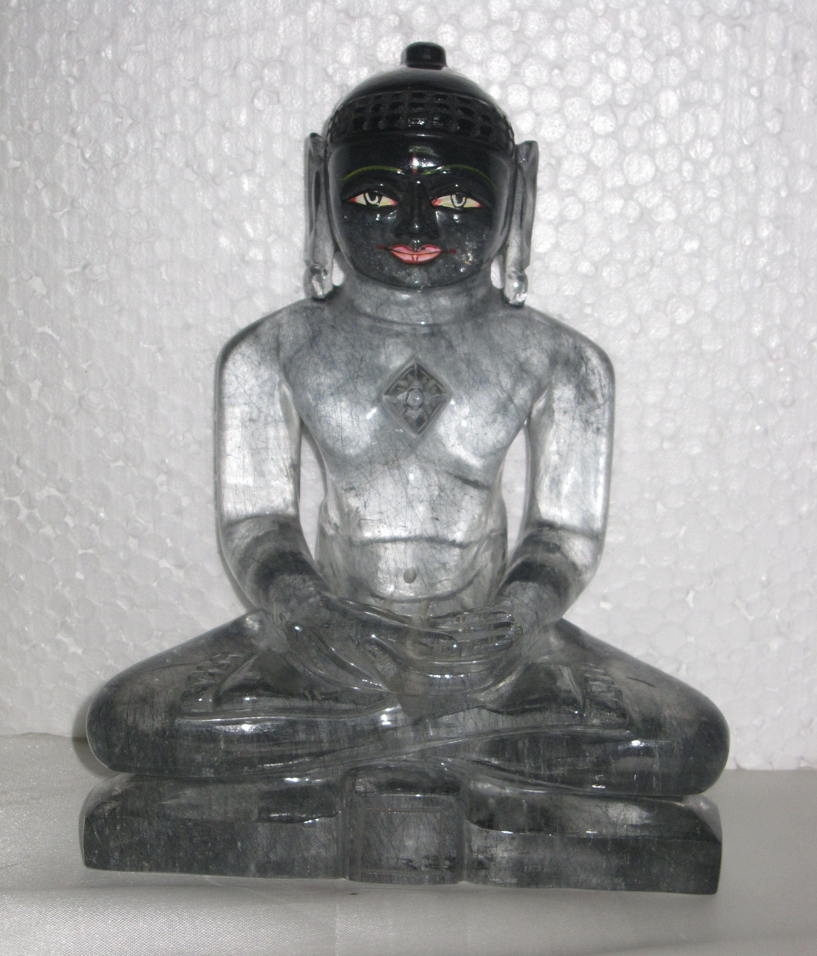 Silver rutiles and silk add splendor and spark to this Tirthankar idol statue. The hands and legs are proportionate and add to beauty of the idol together with a calm and poised face.