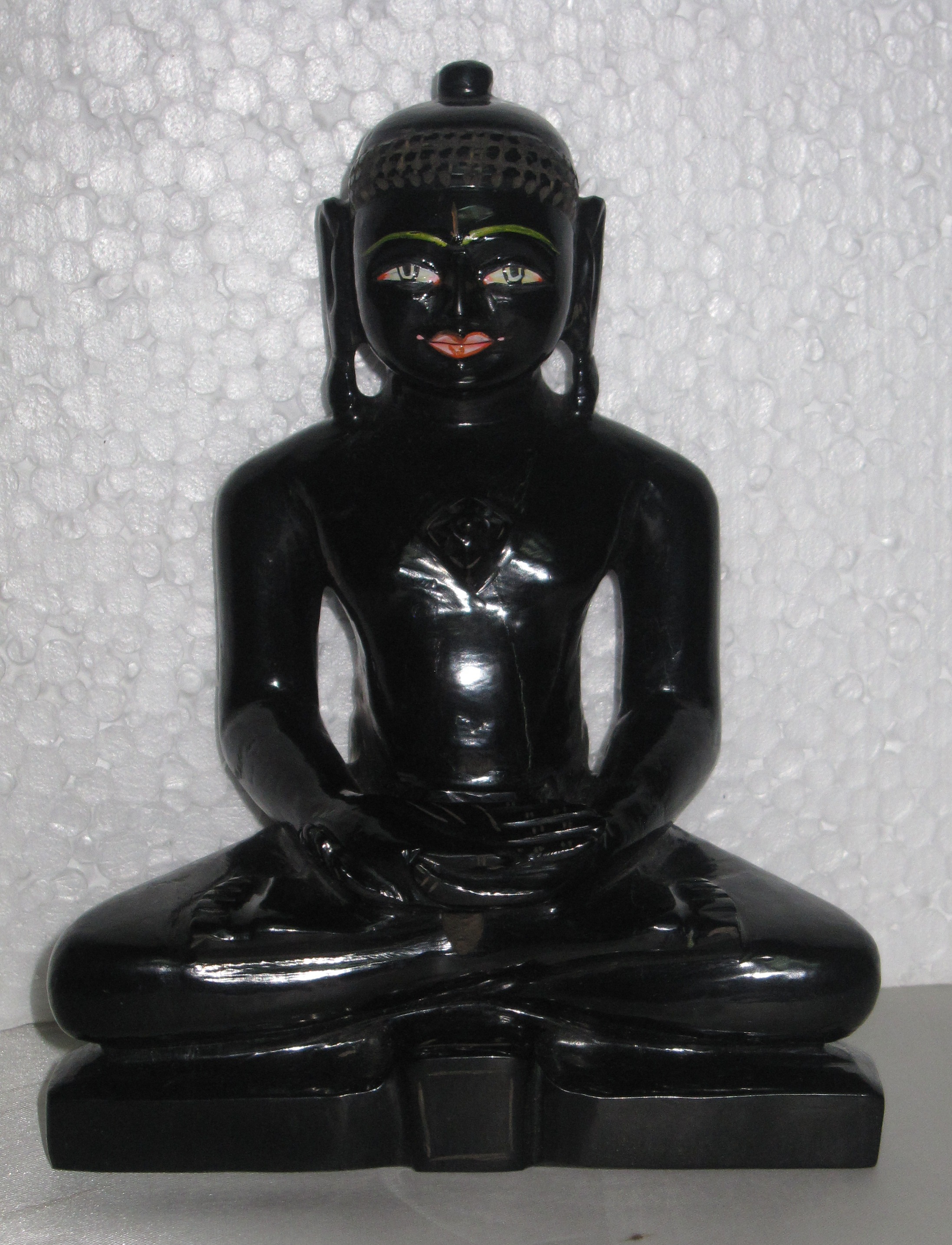 An enormous and bold black statue in Gagate. The face is beautifully highlighted with green brows and pink lips and "tika" on the forehead. The deity is seated calmly on the "Sinhasan" platform in a perfect "Padmasan posture.