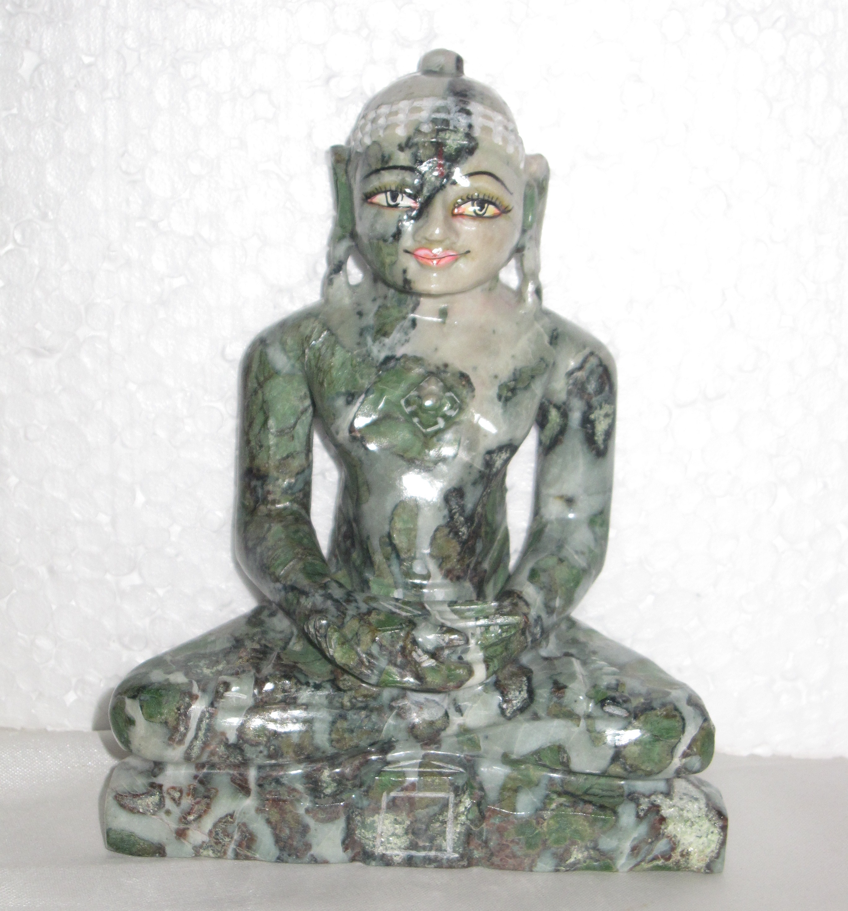 Spotted olive green exquisite rock transformed into a stunning Tirthankar statue. The face id lit evenly with mesmerizing and touching features. The "Srivatsa" symbol on the chest together with a raised platform adds to the divinity of the statue.