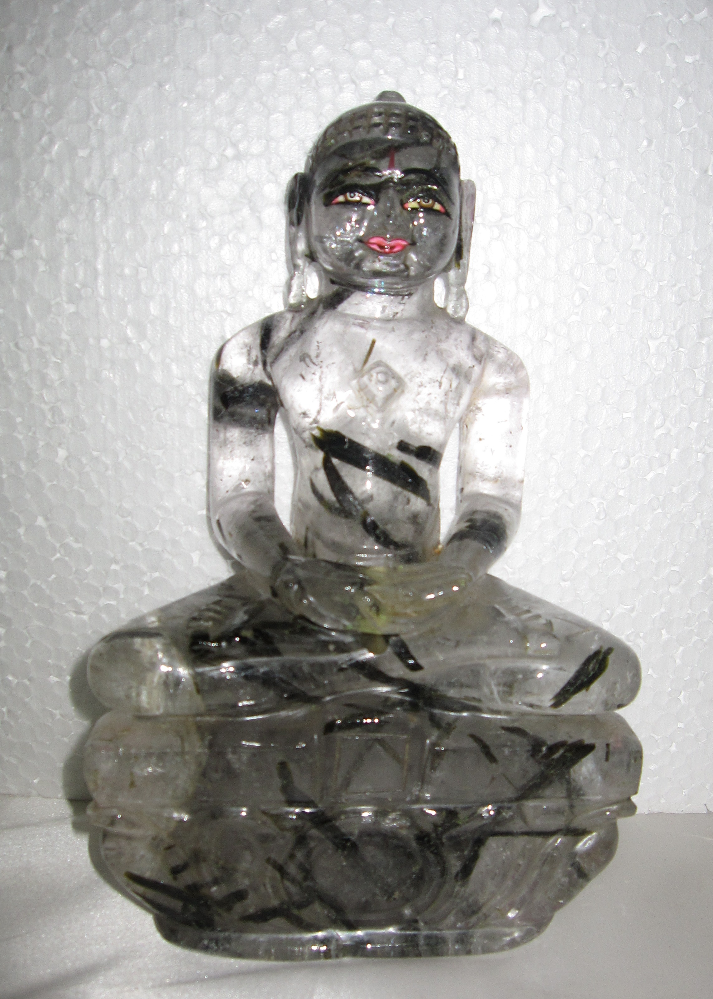 A crystal with black and deep grey stripes adds to the uniqueness of this statue. The double lotus "Sinhasan" platform adds to the supremeness of the statue. A beautiful piece of art indeed.