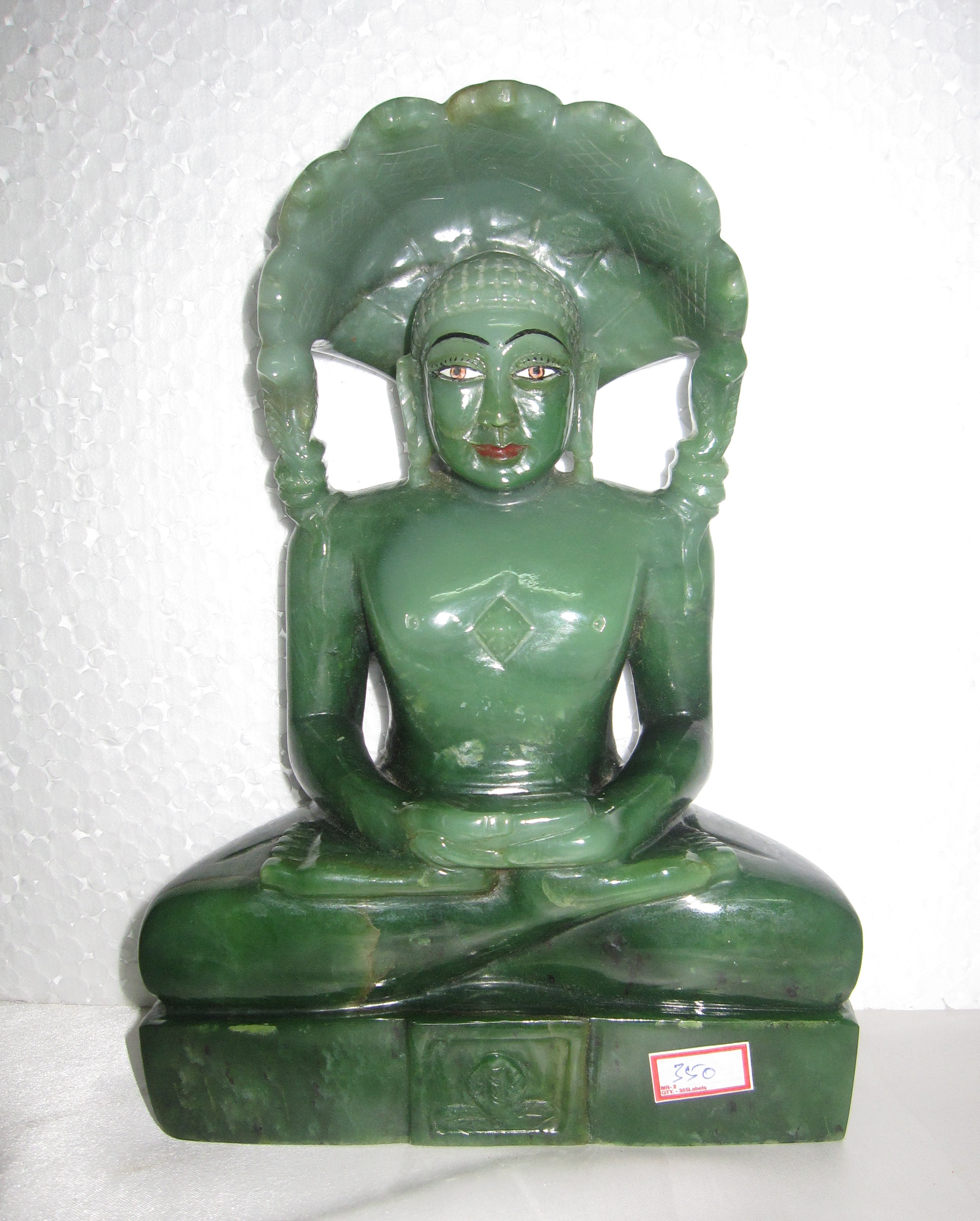 A green extravaganza carved exquisitely by the lapidary into The Tirthankar god "Parshwanath". The Srivatsa symbol on the chest together with a very expressive face makes this a great piece of art.