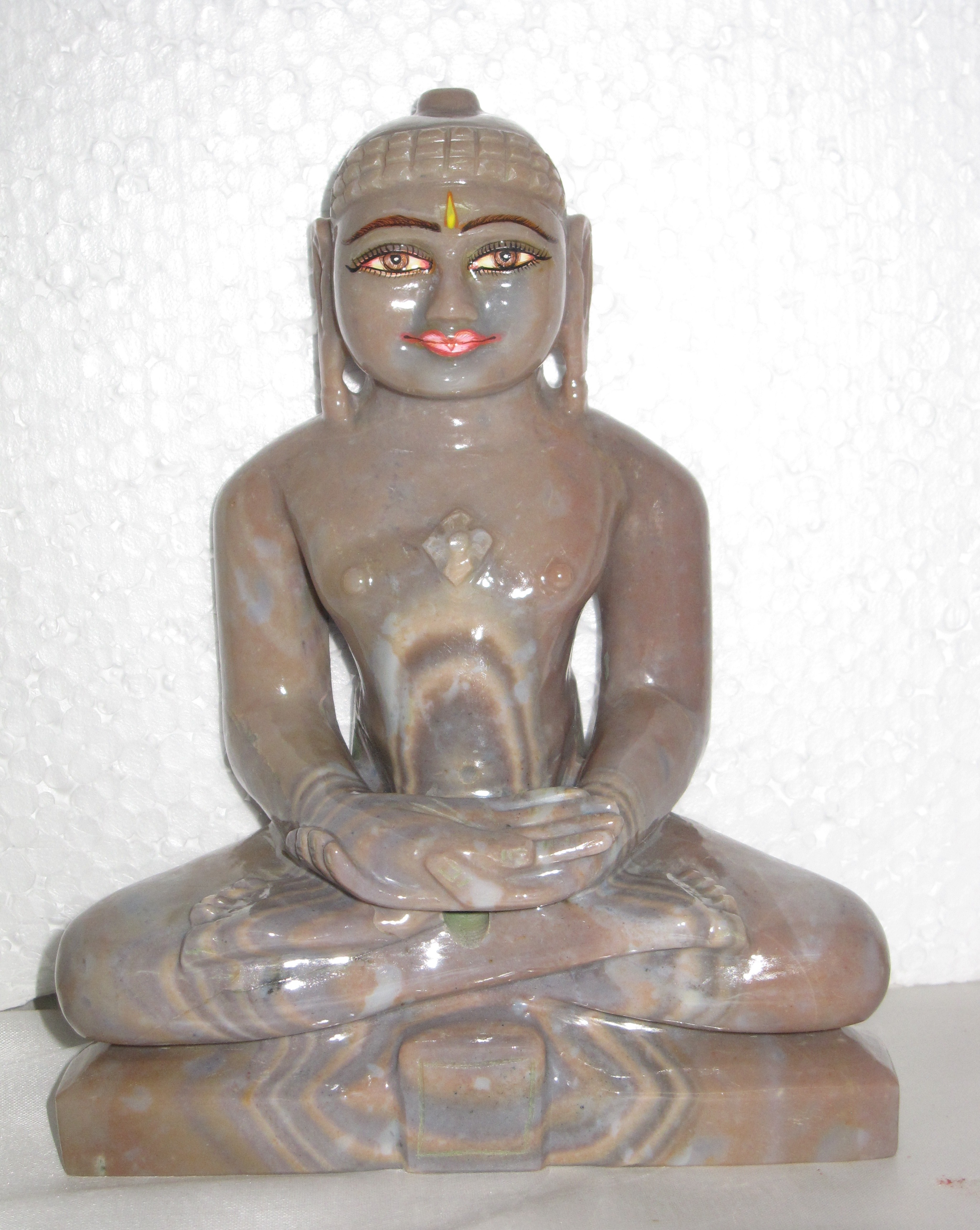 A creative naturally striped boulder transformed gracefully into a beautiful Tirthankar statue. The lapidary has finely arranged the stripes in a classic symmetry. Facial expressions are well defined.