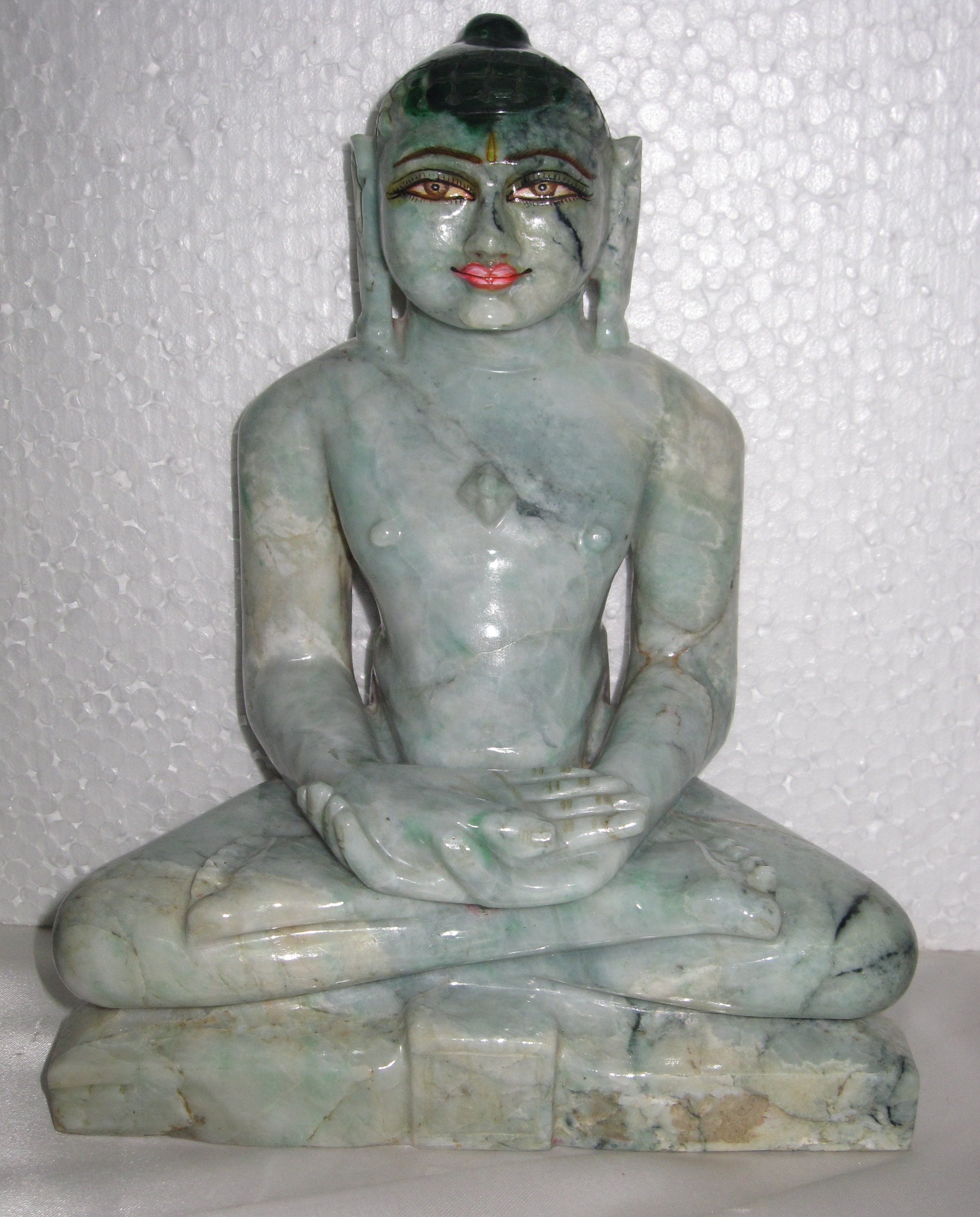 A patchy beauty in pale shades with beautifully carved hands and legs. The deity is seated comfortably on a Sinhasan platform in Padmasan posture.