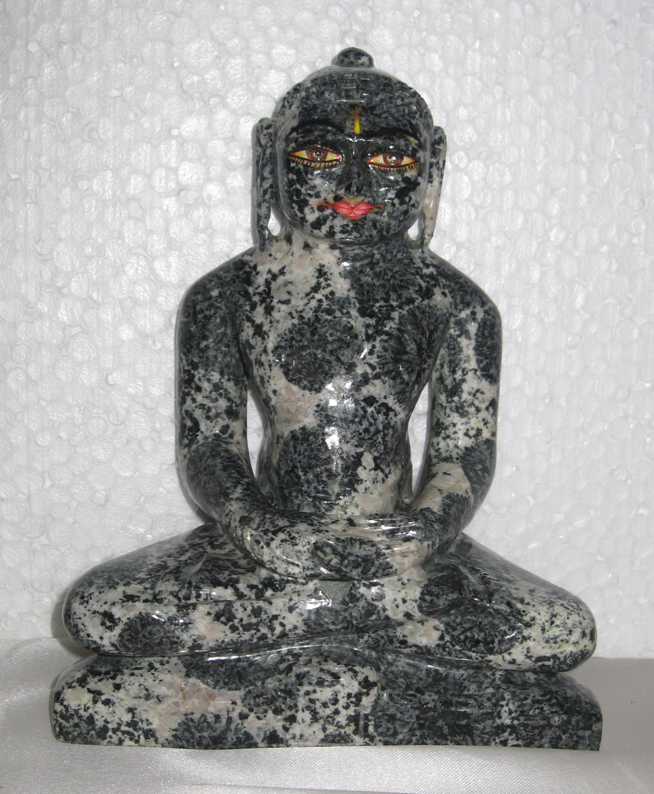 A patchy beauty in grey and white in a perfect Padmasan posture, splendid eyes and great body proportions. The deity is seated on a Sinhasan platform.