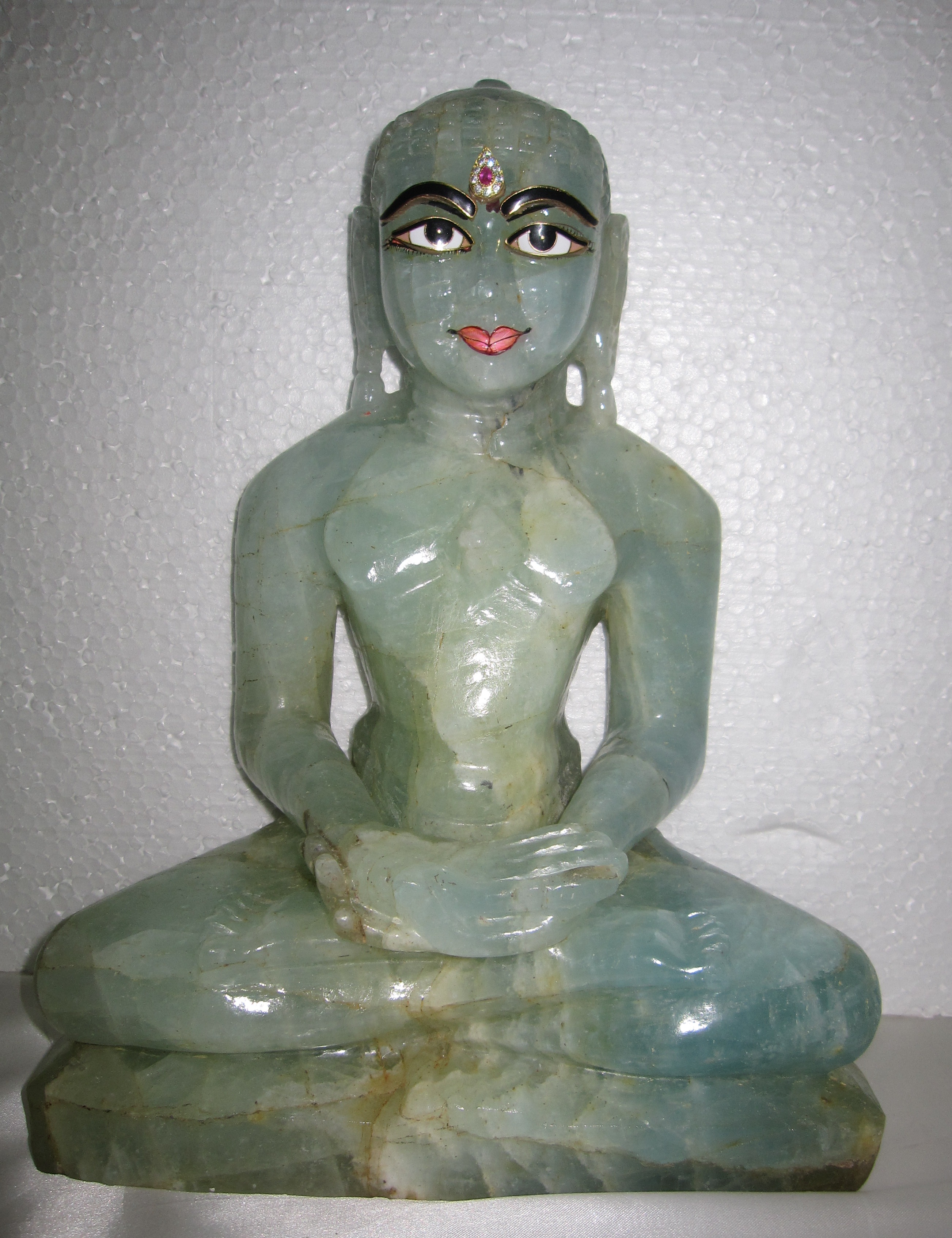 Hues of blue create a very classic effect in this pujyaniya Tirthankar idol. The deity is seated in prayer on a Sinhasan platform.