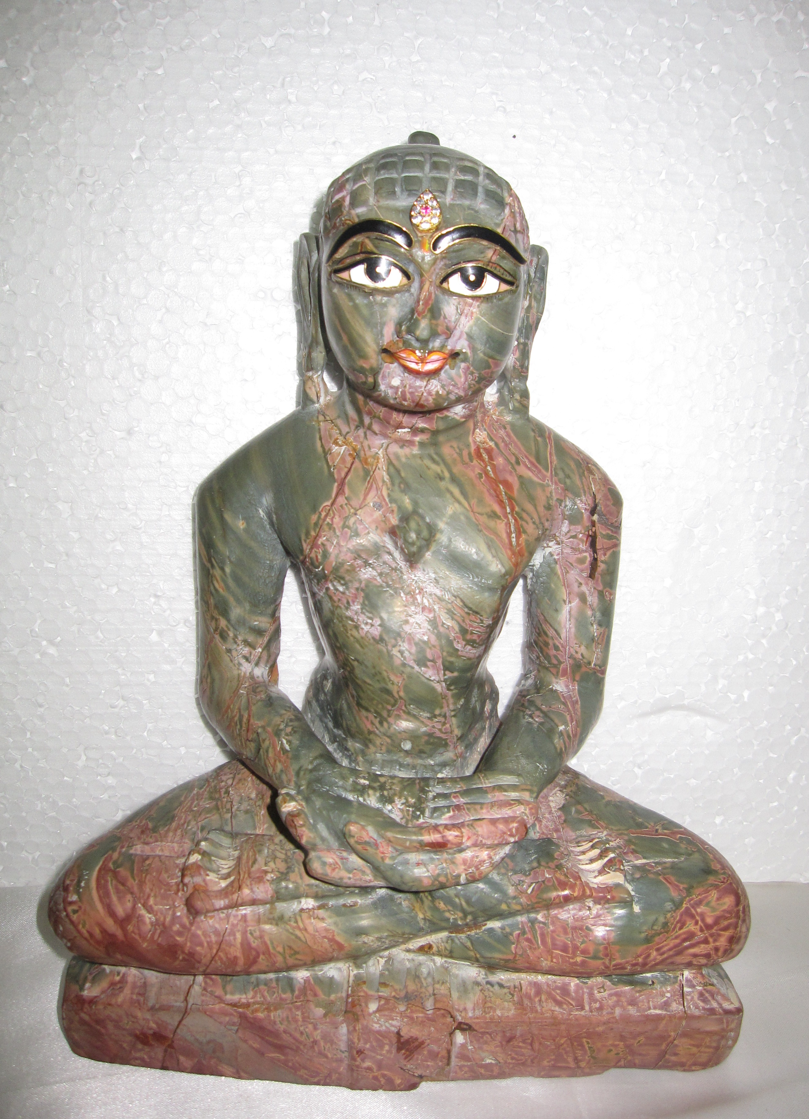A classic rose and green Tirthankar idol with extremely expressive eyes and a mesmerizing smile. The Srivatsa symbol on the chest adds grace to the deity.