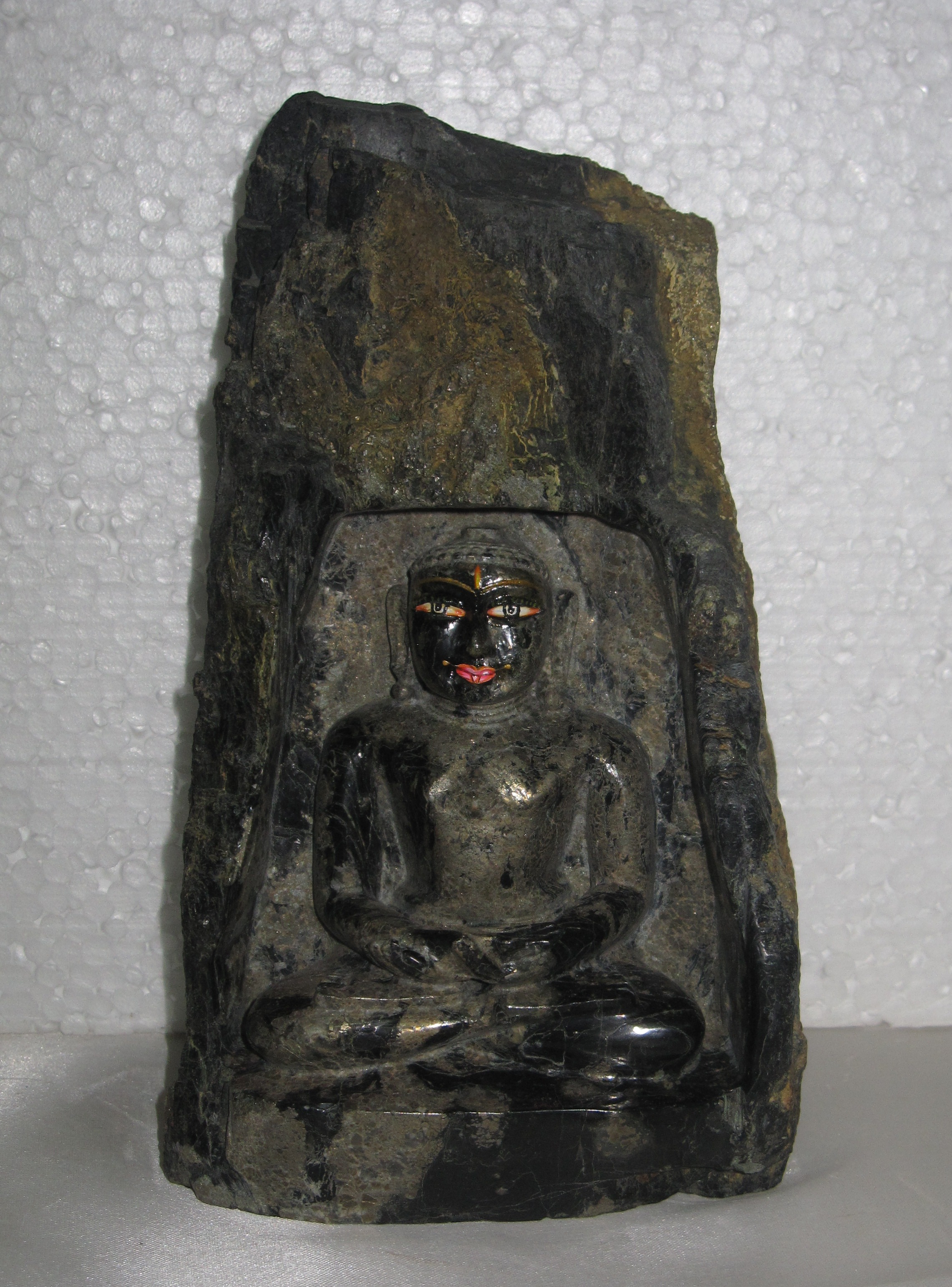 A classic half carving in dim grey with the Tirthankar image carved out of a single boulder. The face is well defined and highlighted.