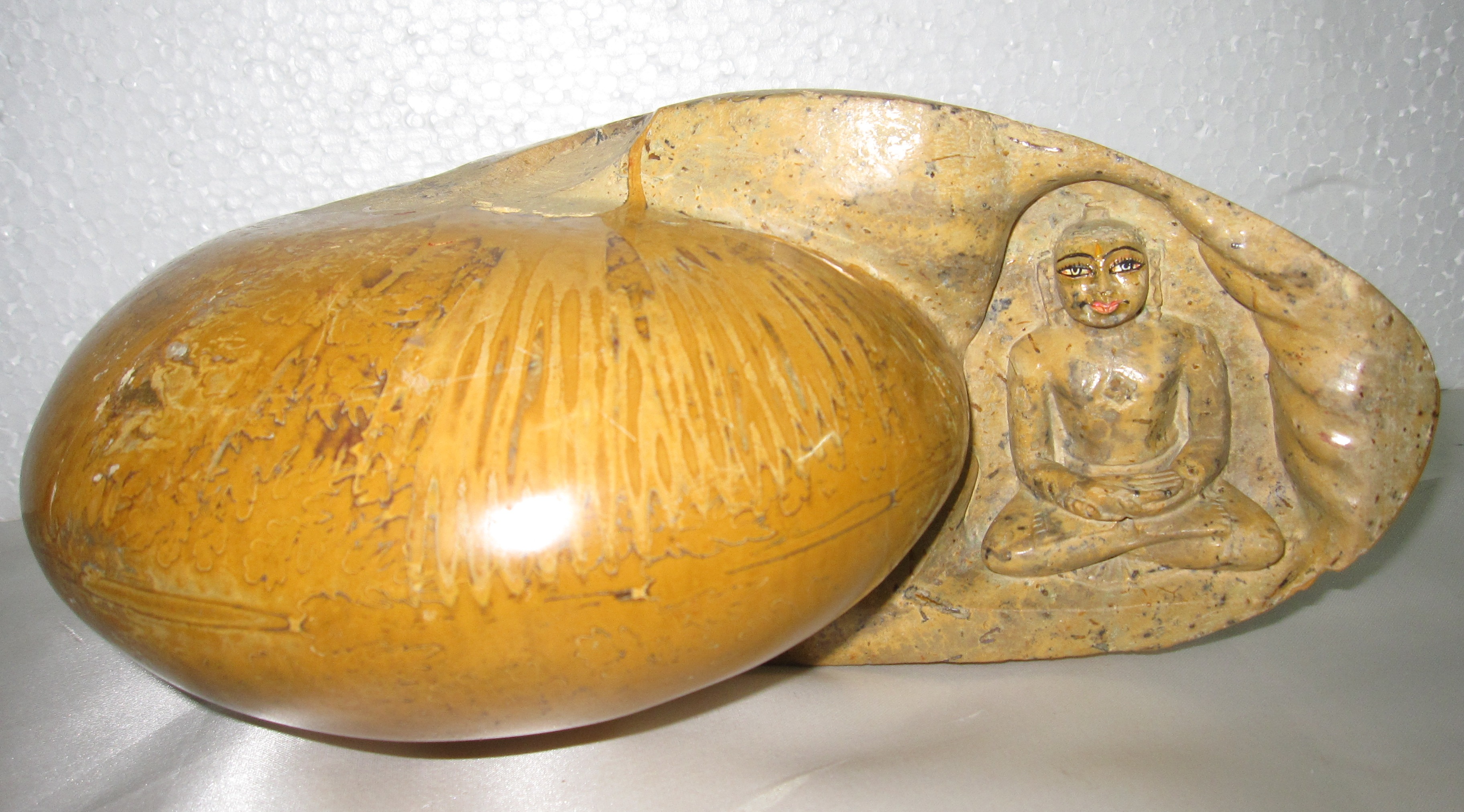 An aesthetic beauty in yellow, absolutely gorgeous concept with the deity seated on one side in deep prayer and meditation, while the classic lustrous oval figure on the other side.