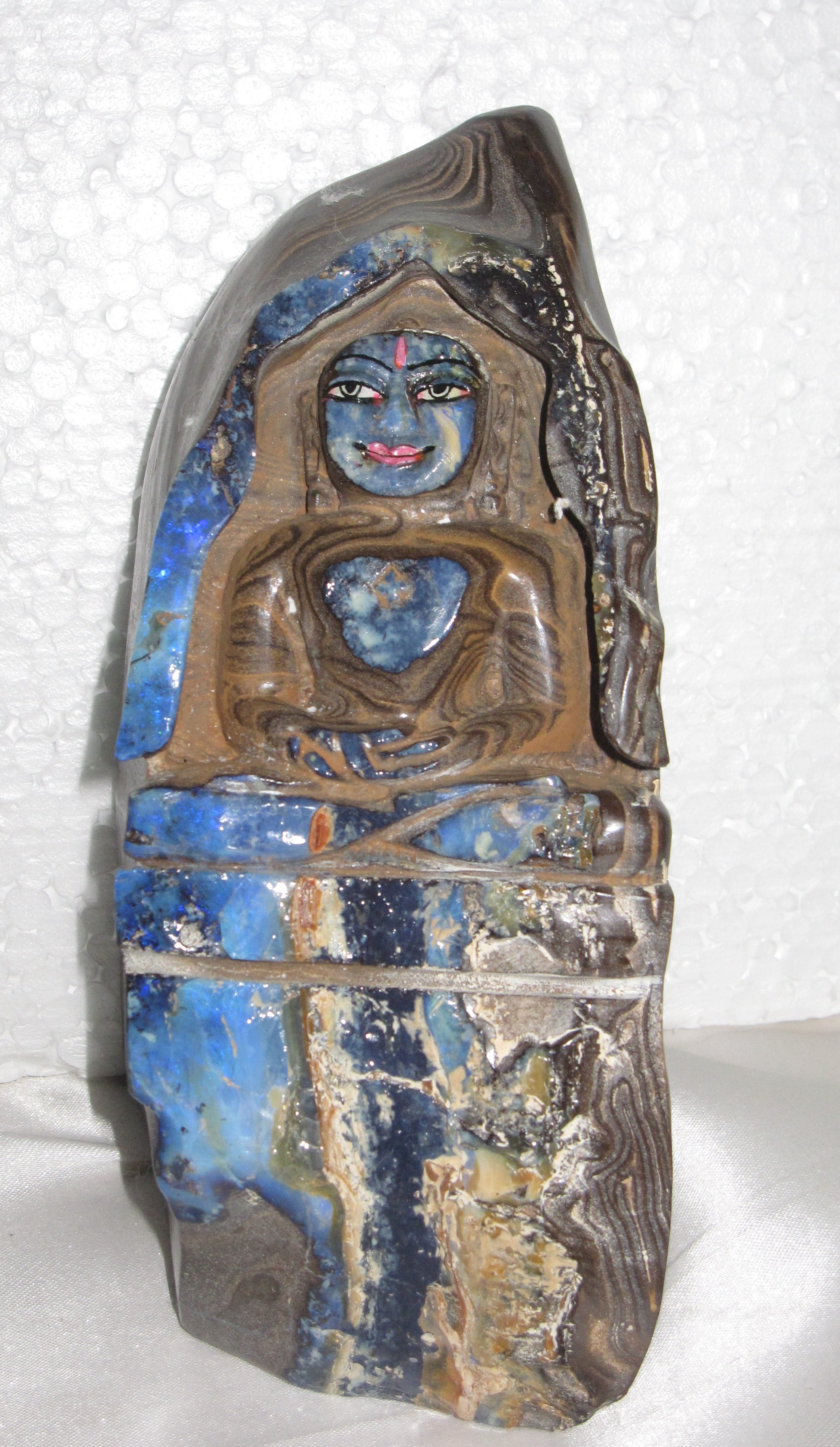 A mystic beauty in slate blue with classic earthen tones as well. This half carving exuberates immense aesthetic beauty also showcasing exemplary lapidary craftsmanship. The pink accents on the face highlight the deity.