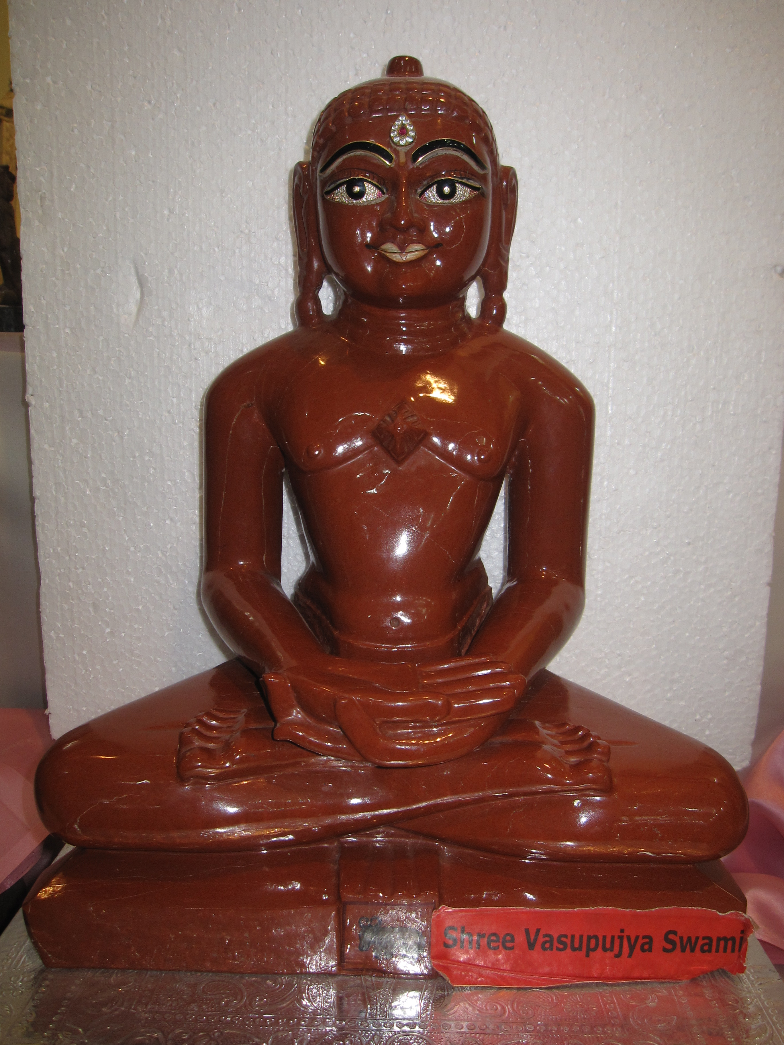 A classic deep red deity seated on a Sinhasan platform emitting tranquility and peace. The body proportions are well governed by the lapidary with well chiseled hands and feet.