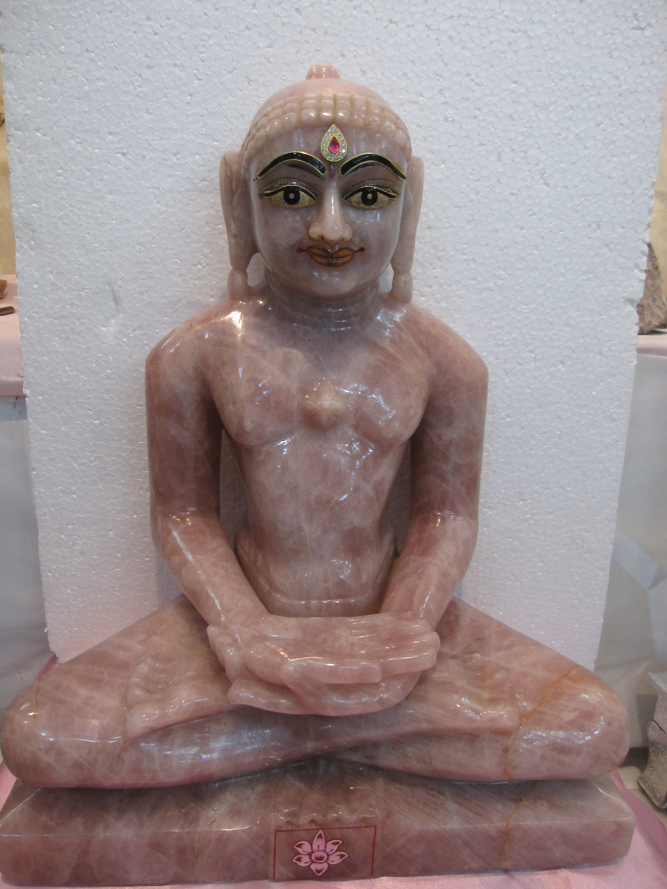 Rosy splendor awaits you in full bloom with the most mesmerizing facial expressions. Hand and legs folded in deep prayer and seated royally on a "sinhasan" platform.