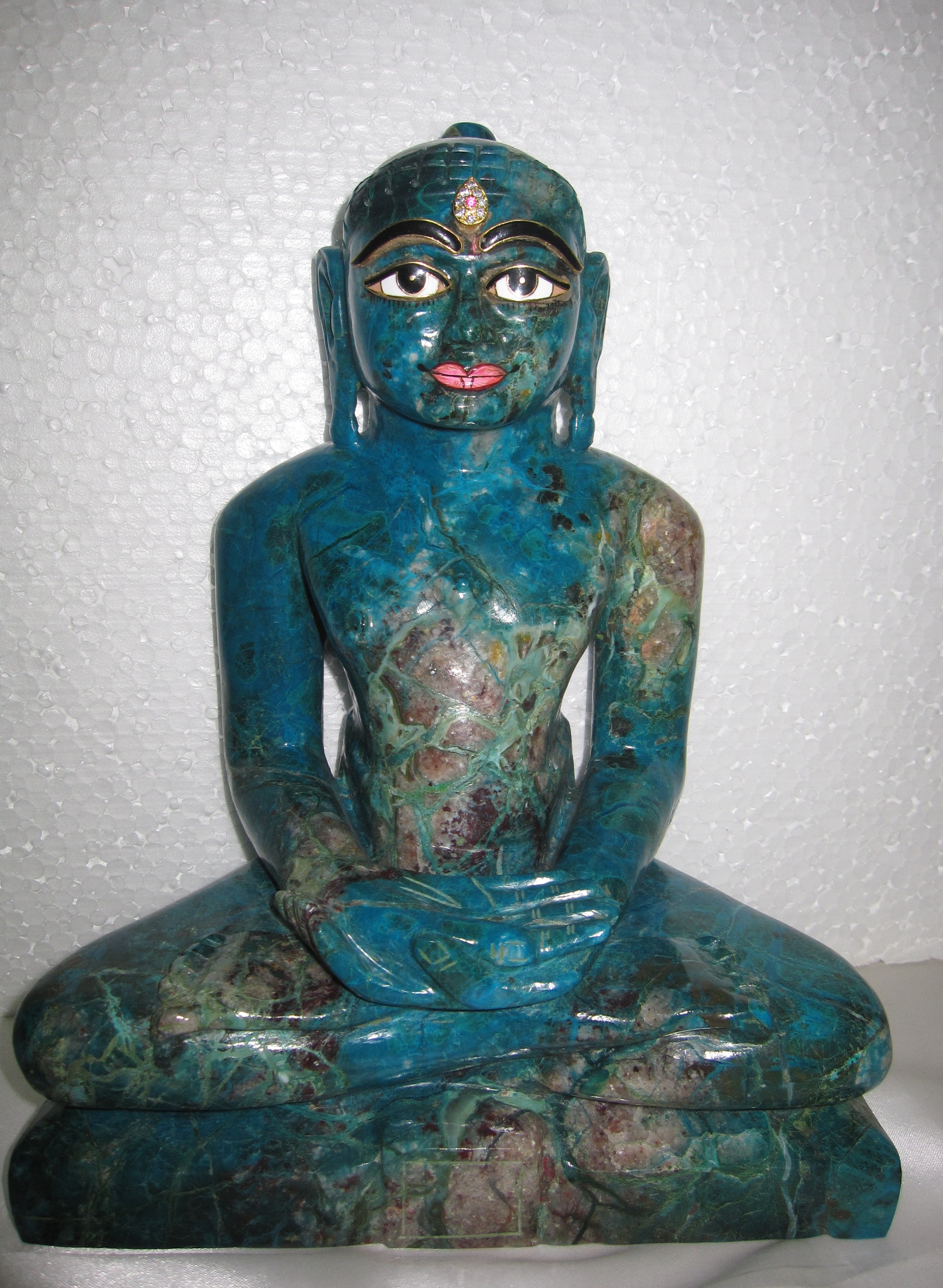 Splendor in blue and brown with the most amazing dispersal of hues. Hands folded in prayer and placed very carefully on the folded legs. The face is well defined and beautifully highlighted.