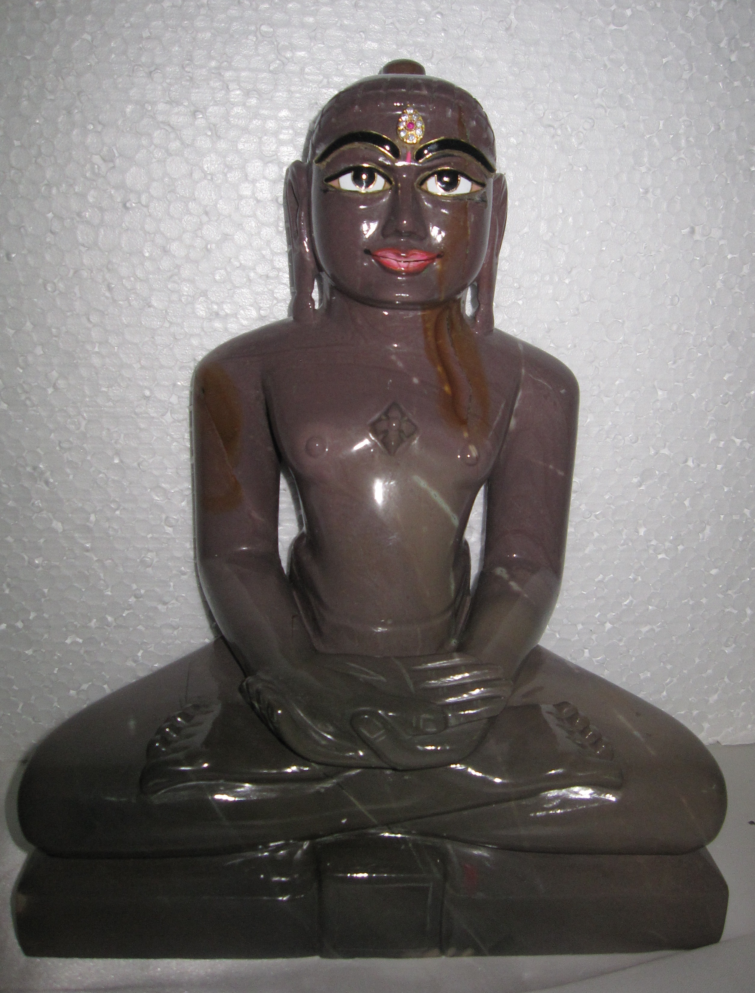 Rosy pink lips and eyes beautifully shaped combine to create a mesmerizing effect to the statue in plum. The Srivatsa symbol on the chest adds to the divine nature of the Tirthankar.