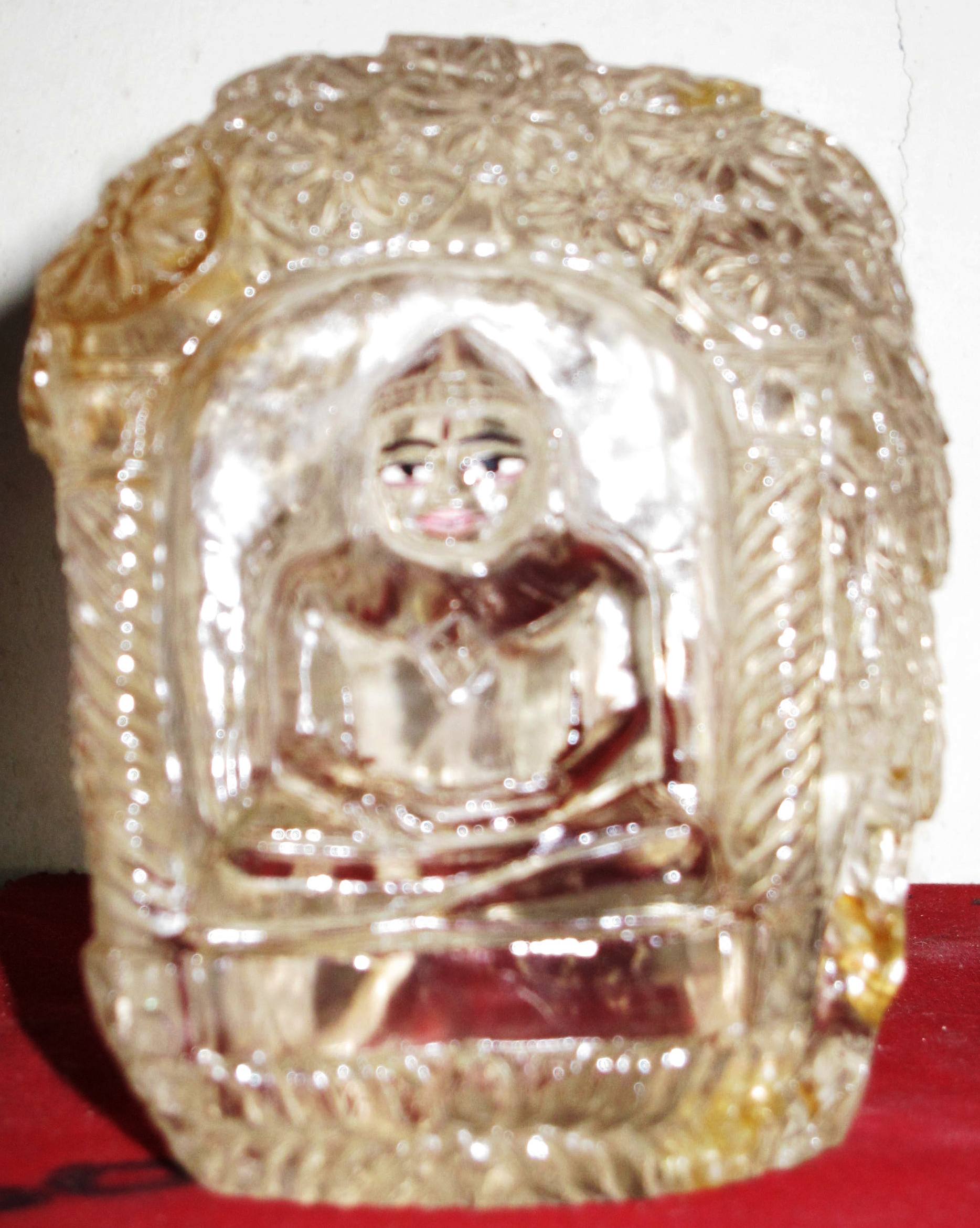 A "darshaniya" Tirthankar idol statue in citrine seated calmly amidst floral carvings. The facial features are divine and calm and add aesthetic to the beauty of the statue.