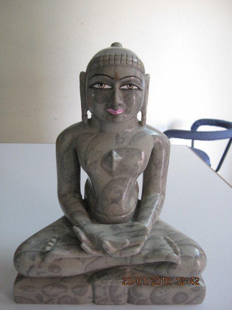 A grey patchy beauty with classic eyes and luscious rosy lips carved beautifully into a mesmerizing Tirthankar idol. The body proportions are perfect together with a Padmasan posture.