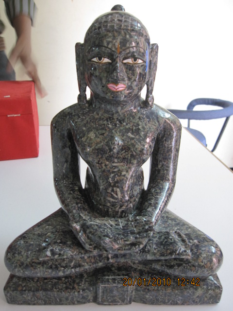 A spotted and elegant grey Tirthankar idol seated calmly on a sinhasan platform. Hands are placed on each other calmly, aesthetically adding to the beauty of the statue.