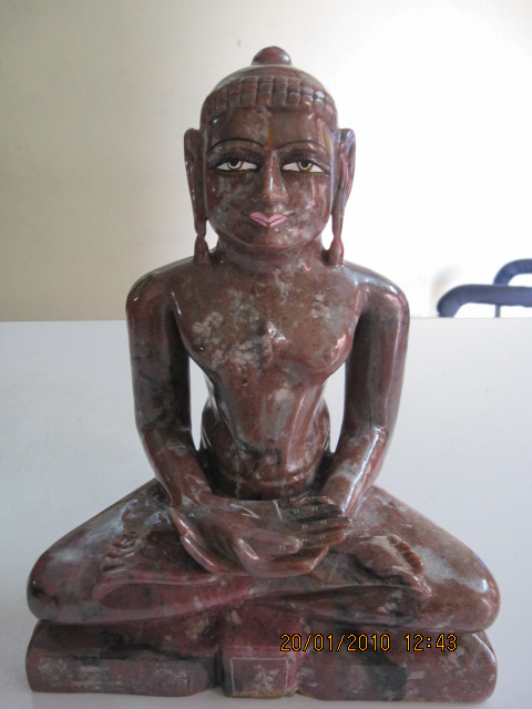 A deep red brown Tirthankar idol with calm and poised divine features. The upper body is well proportionate with the lower part and the hands are folded deep in prayer.