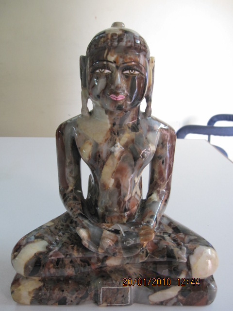 A patchy Tirthankar idol in multicolors with perfect body proportions. The face looks absolutely divine and calm. A beautiful piece of art indeed.