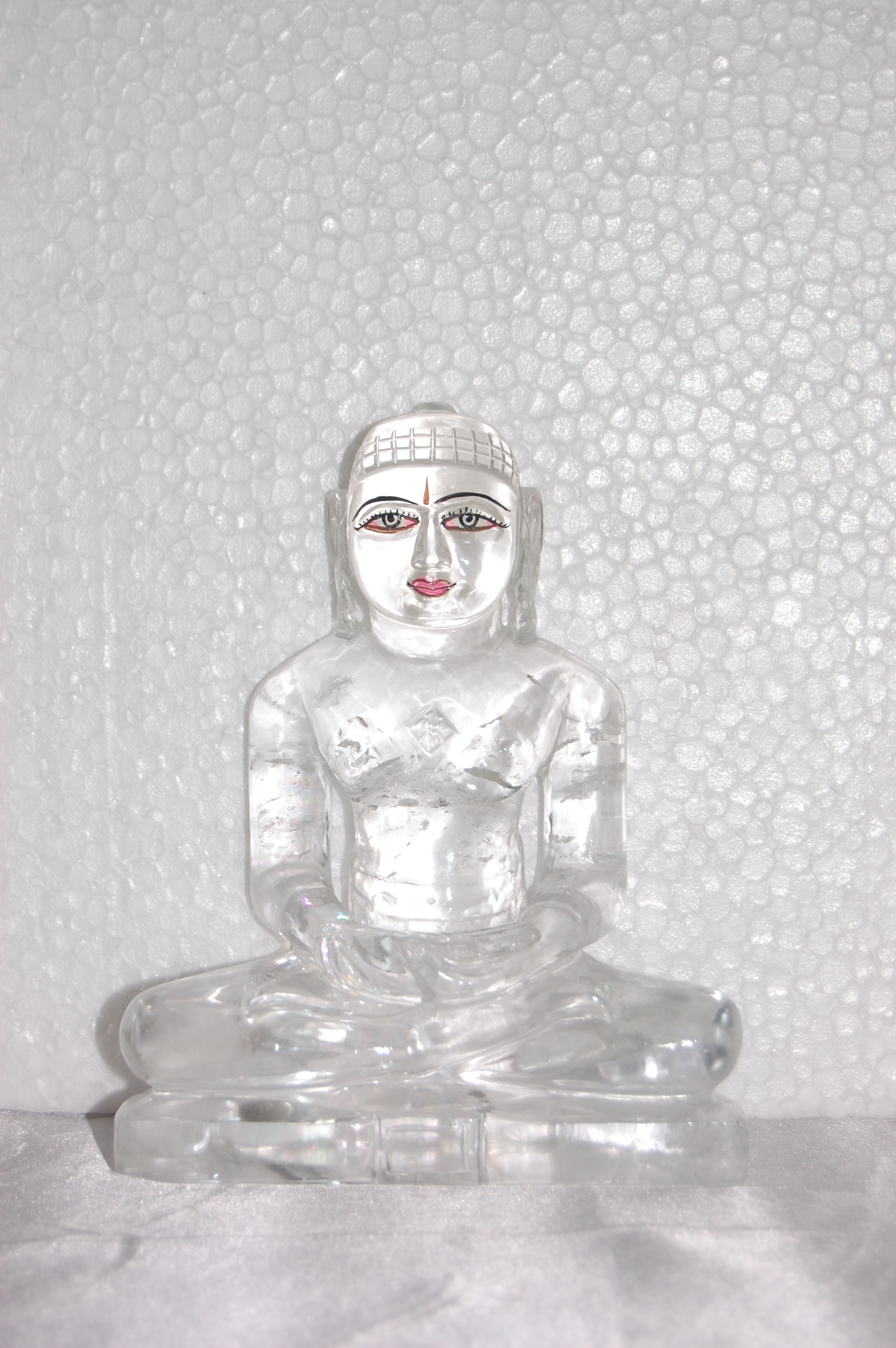 A transparent clear piece of crystal transformed into a divine Tirthankar statue. The body is well proportionate and the calm and placid features add to the mystic nature of the statue.