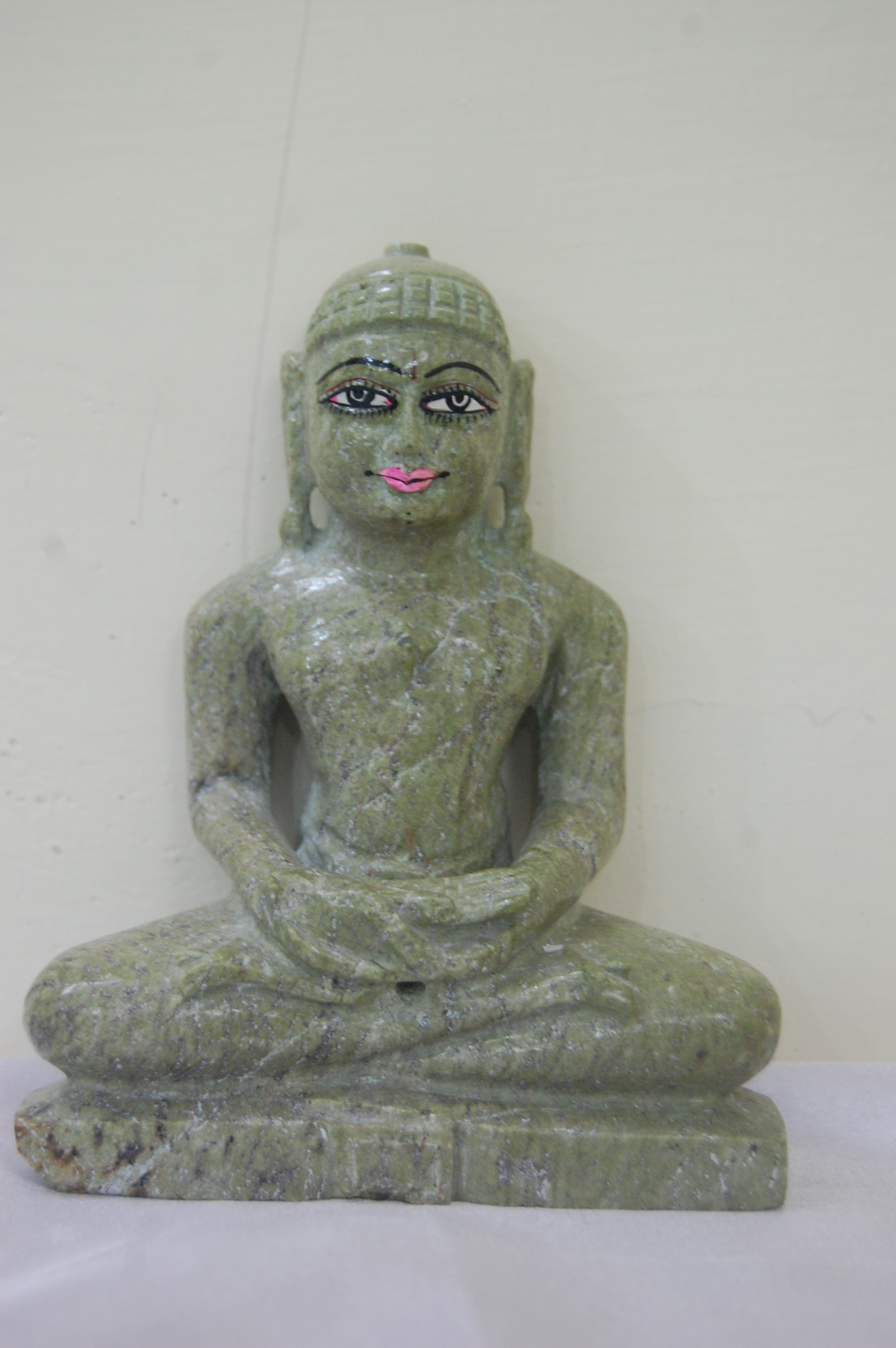 A deep khaki beauty with a tranquil face and eyes and lashes beautifully highlighted. The lips are somber and the deity is seated peacefully in prayer.