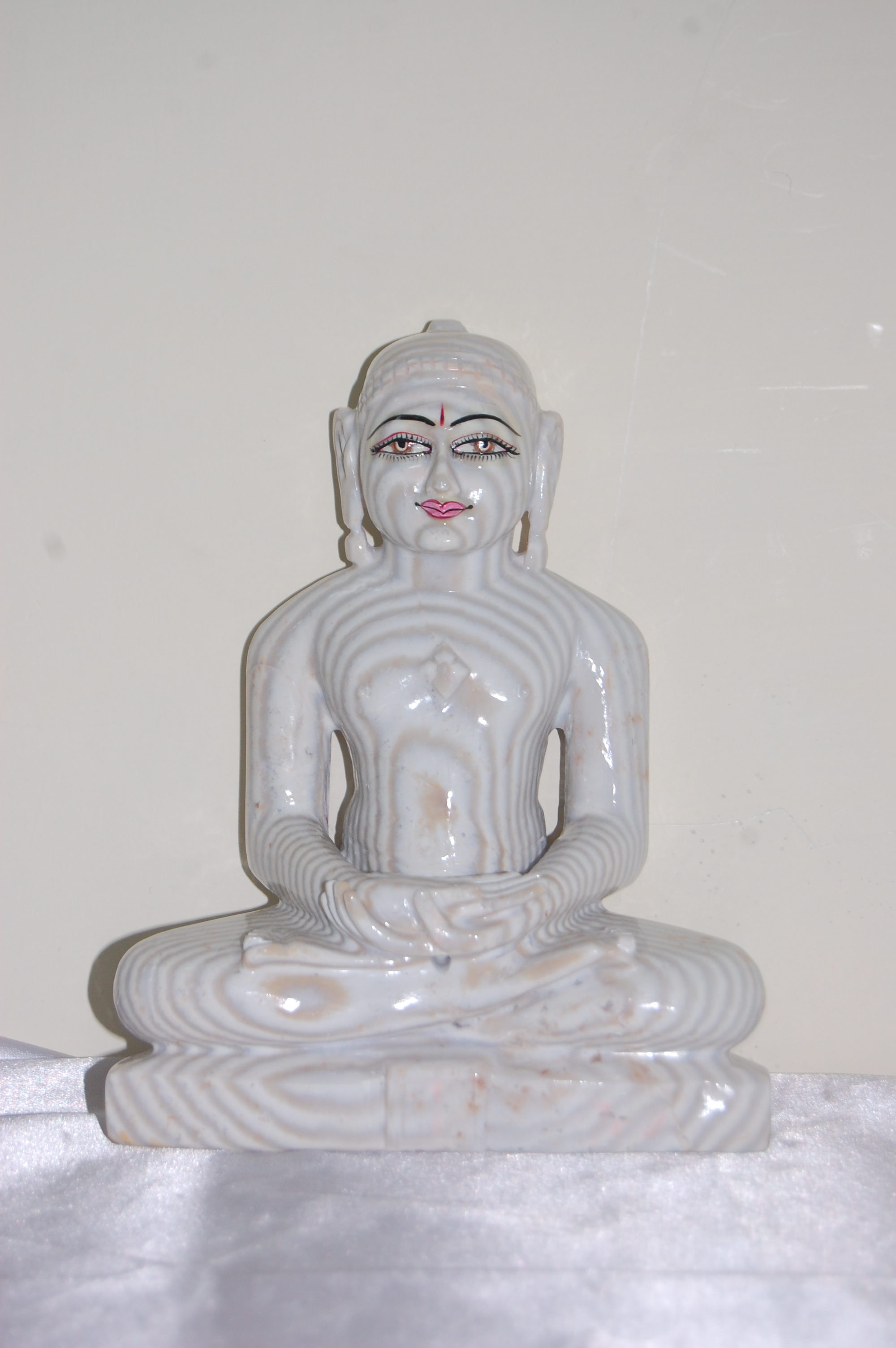 A circular grace in pristine white with a face exceptionally magnetic and gorgeous. Hands folded in deep meditation and a srivatsa symbol on the chest highlighting the aesthetic beauty of the deity.
