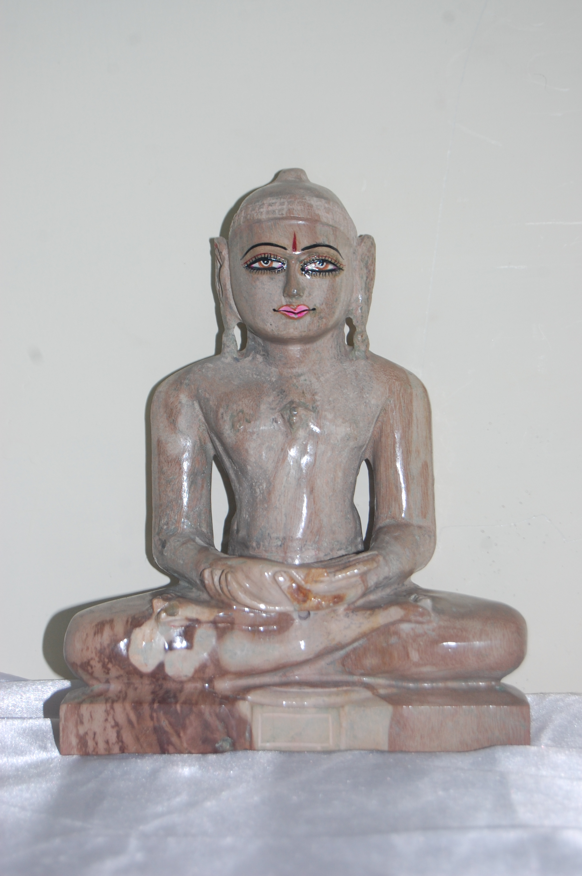 An earthy brown Tirthankar idol with mesmerizing eyes and a magnetic smile. The chest is erect with a glittering srivatsa symbol. Hands folded in deep meditation add aesthetic appeal to the statue.