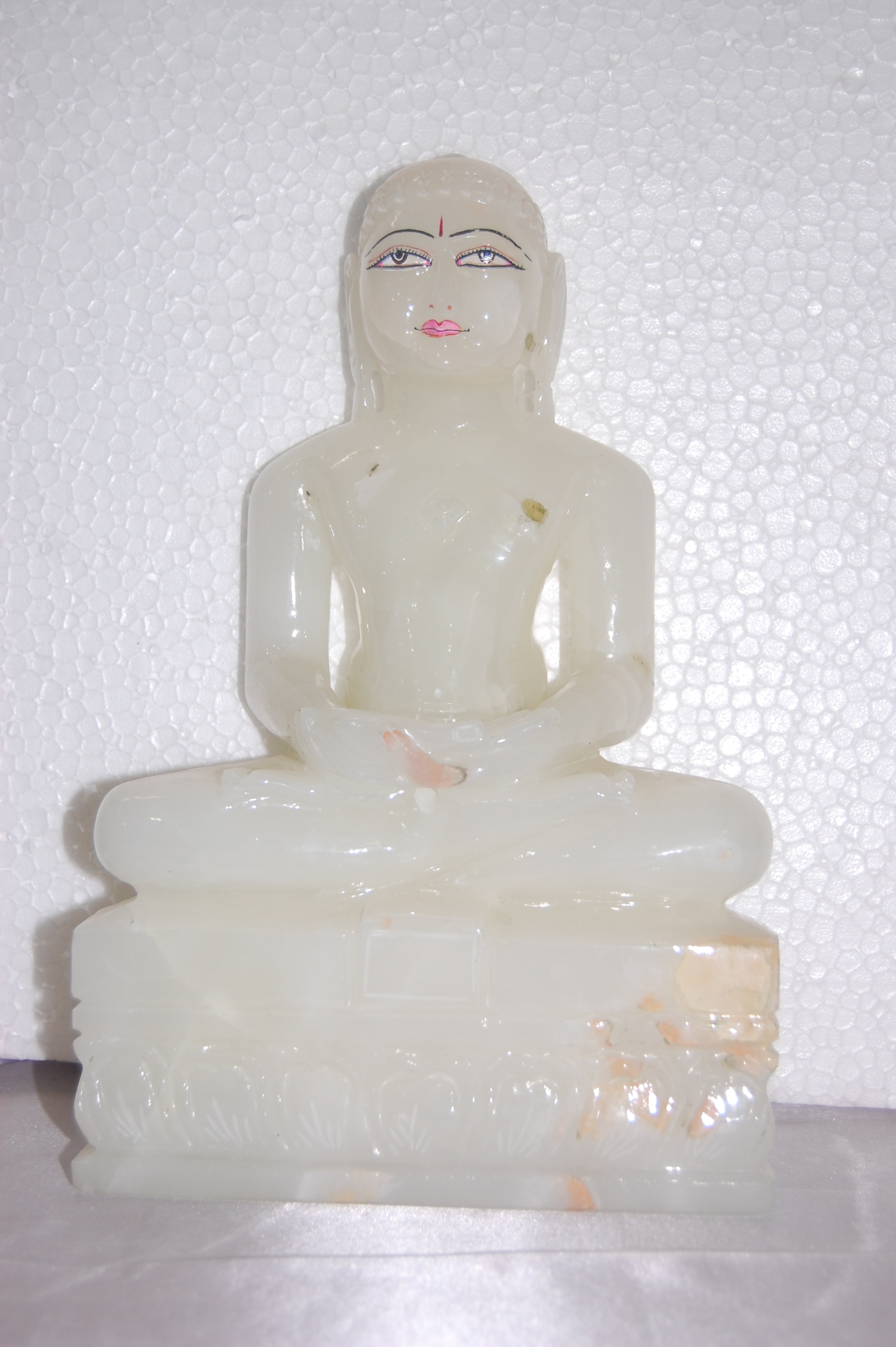 An alluring white Tirthankar idol seated calmly on a double lotus Sinhasan platform. The srivatsa symbol on the chest adds to the divine nature of the idol and highlights the serenity depicted by the face,