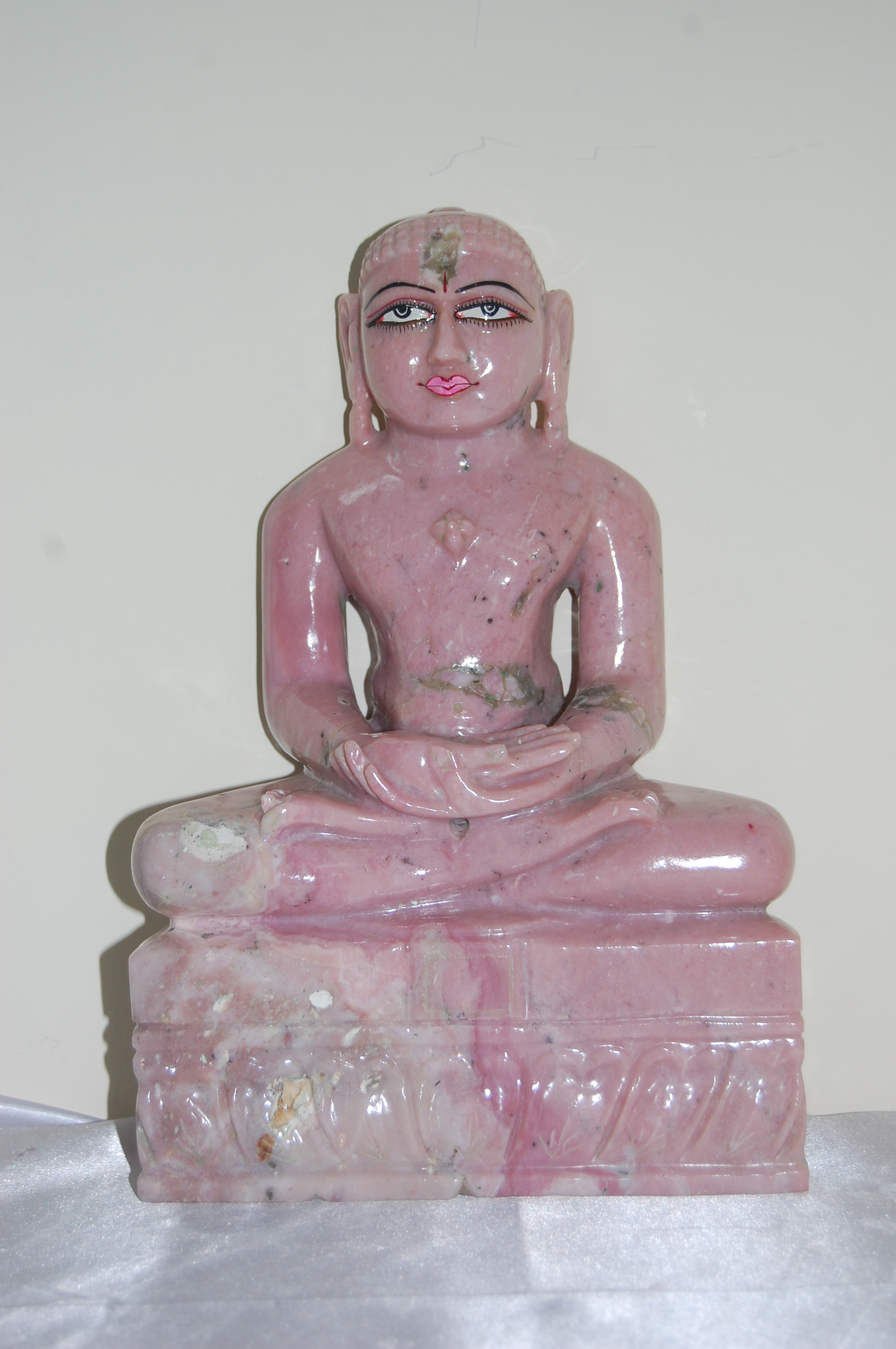 A calm and serene Tirthankar statue in rosy pink with a classic sinhasan platform. The face is very poised and eyes exceptionally peaceful.