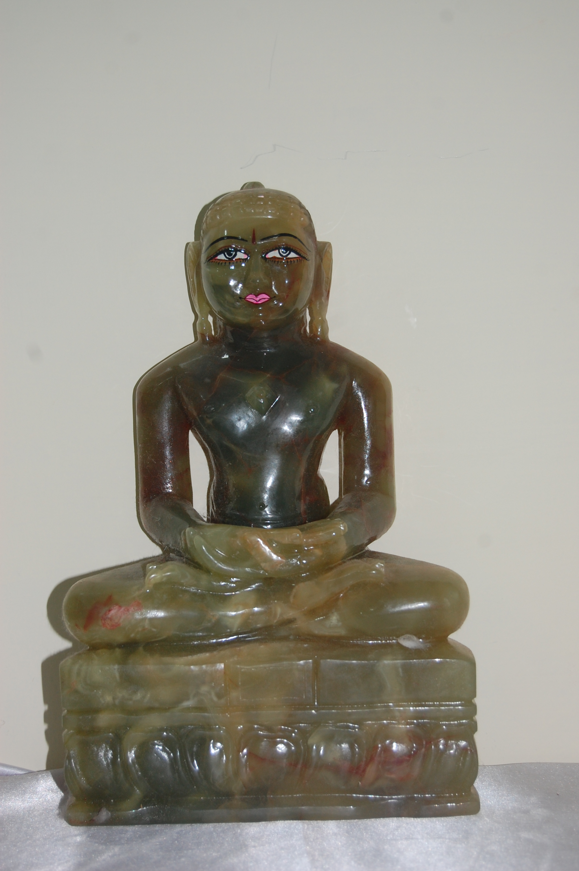 An earthy hued statue with calm & poised eyes and a rosy and contented smile. The hands and legs are religiously folded deep in meditation.