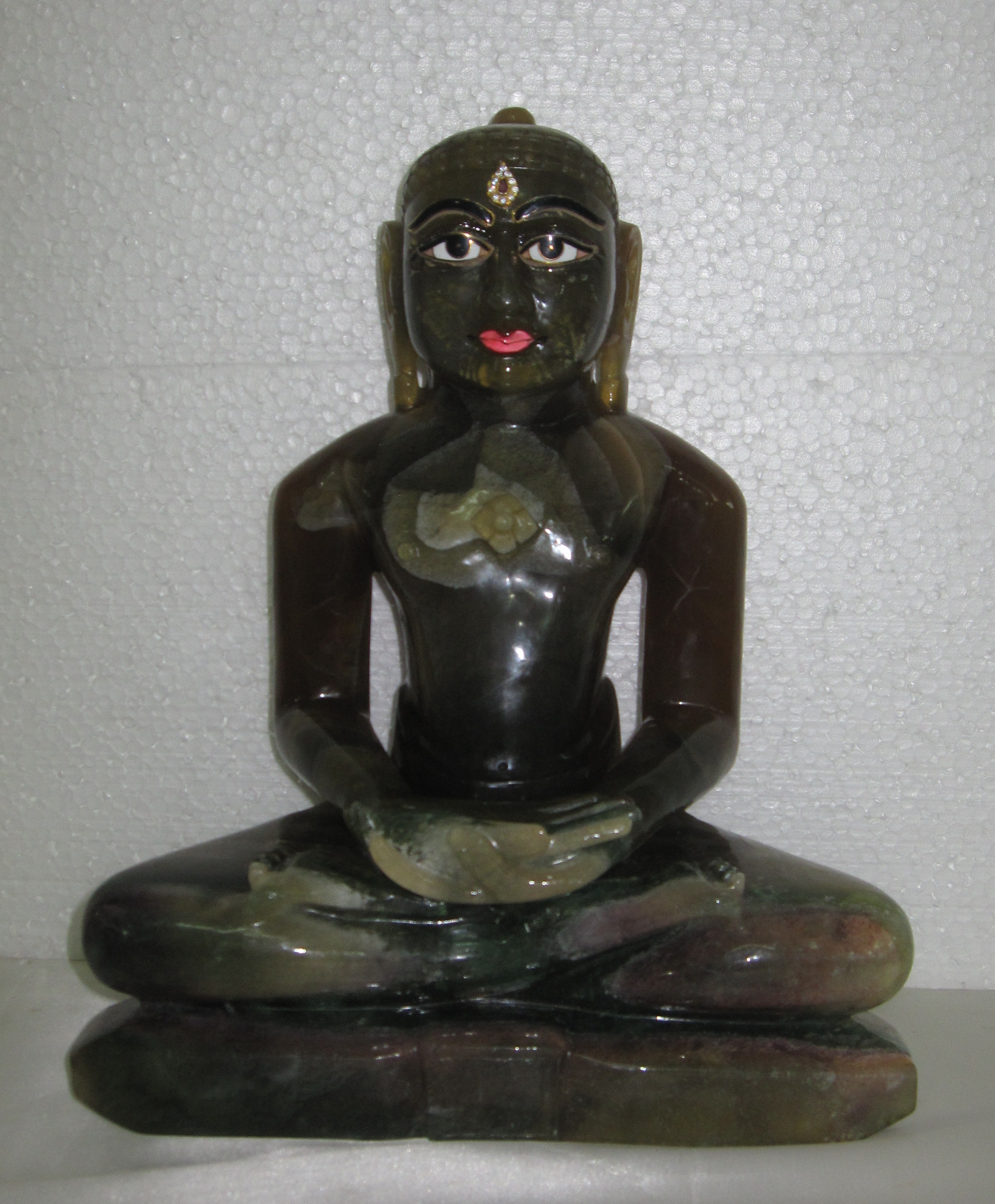 A stripy deep green Tirthankar statue with pink luscious lips and expressive eyes. Hands folded in deep prayer and the posture is a perfect Padmasan.