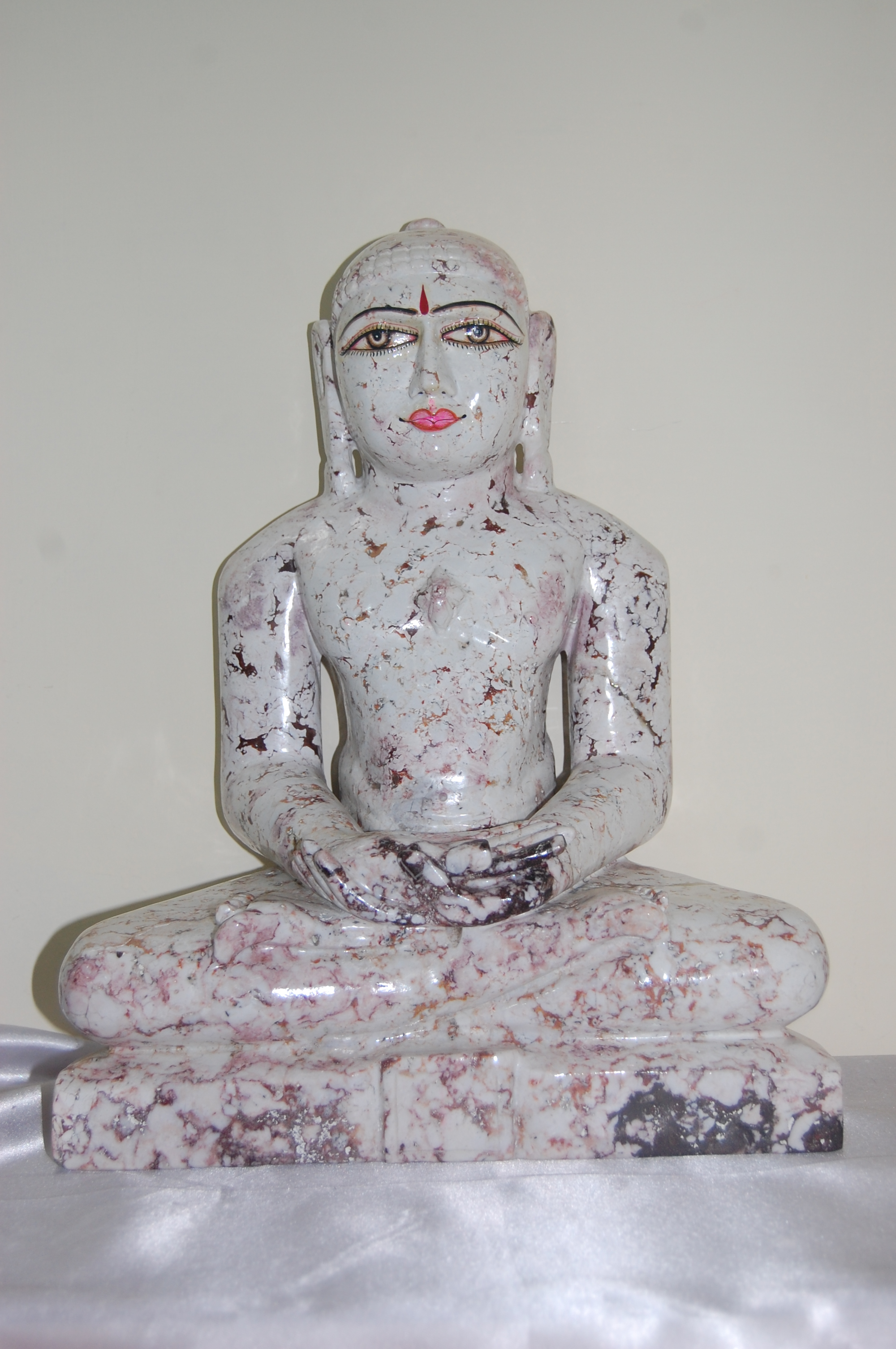 A lined and spotted extravaganza in perfect Padmasan posture. Hands folded divinely and the srivatsa symbol on the chest adds to the spiritual beauty of the statue.