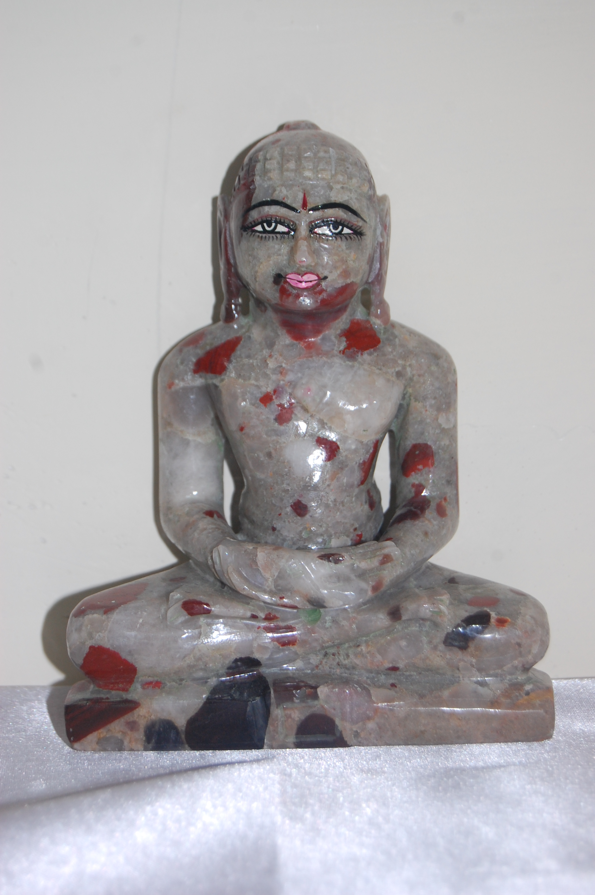 A maroon and black spotted Tirthankar statue with classic facial features. The eyes are very expressive