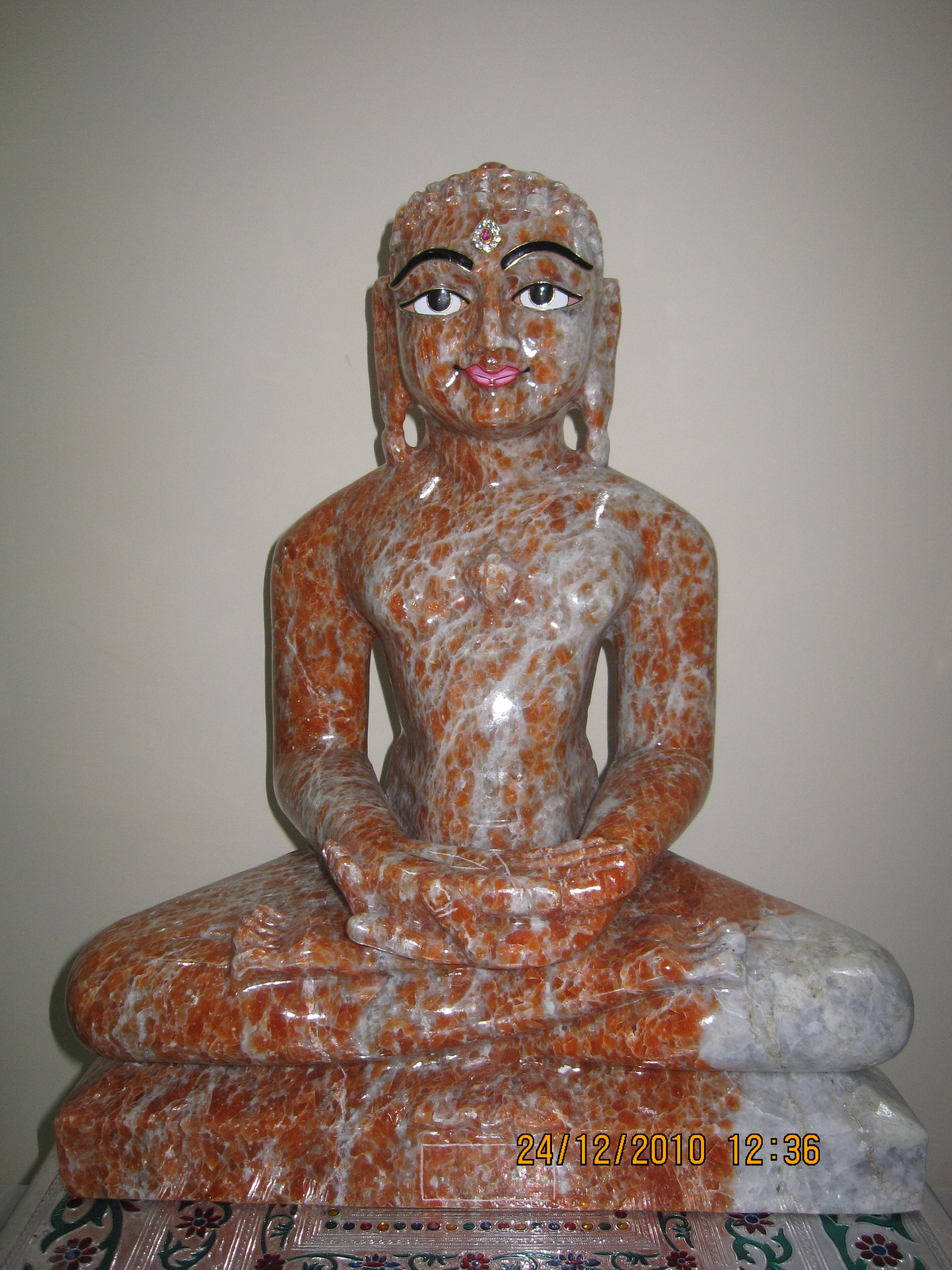 An earthy patchy Tirthankar statue in the landscape stone, Jasper. The face is well depicted with a gorgeous smile and expressive eyes.