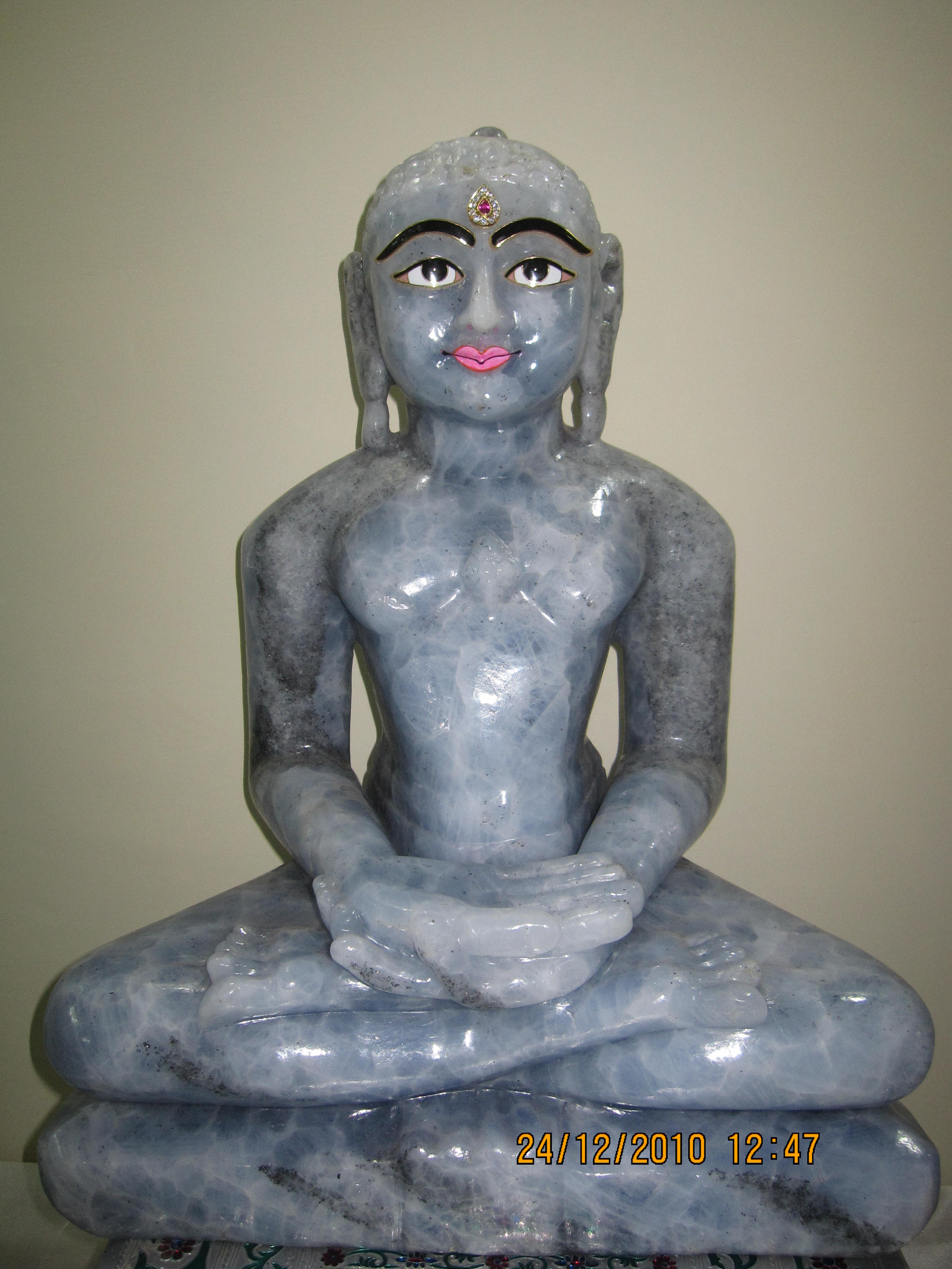 A splendid icy blue Tirthankar statue with an amazing smile and the most mesmerizing face. The lapidary has worked remarkably to create this masterpiece.