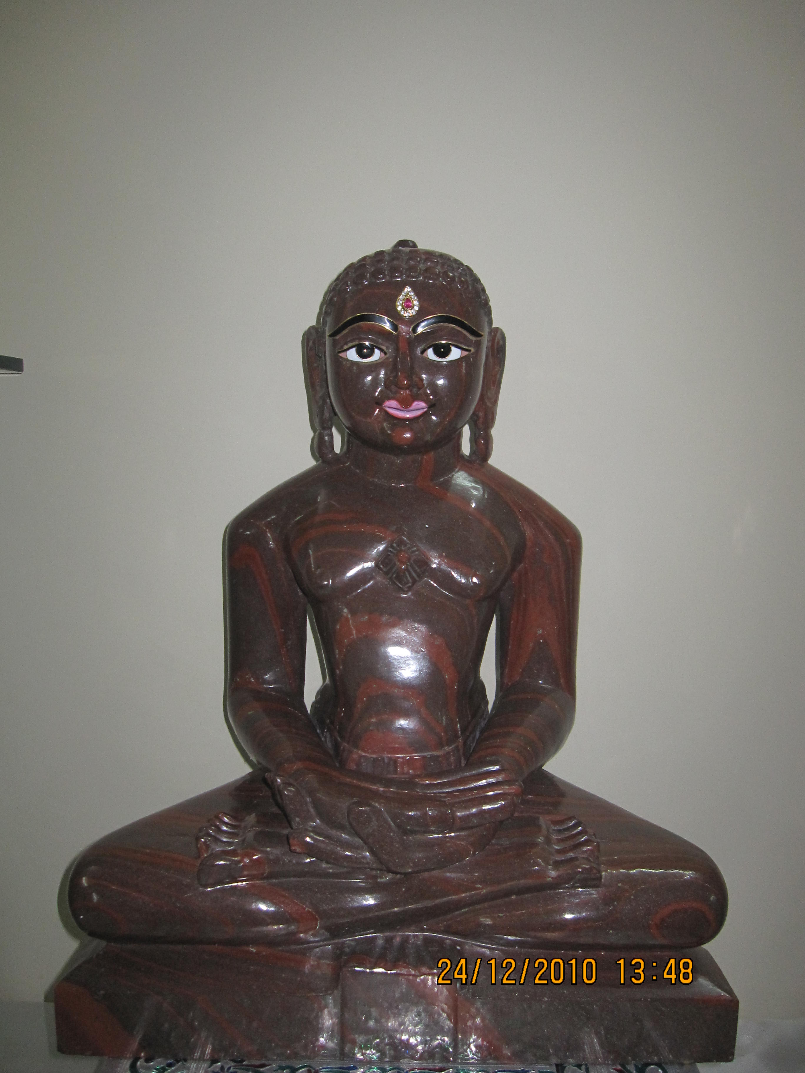A splendor in brick red, well chiseled out of a single boulder of rock. The facial features are divine with a mystical smile and very expressive eyes.