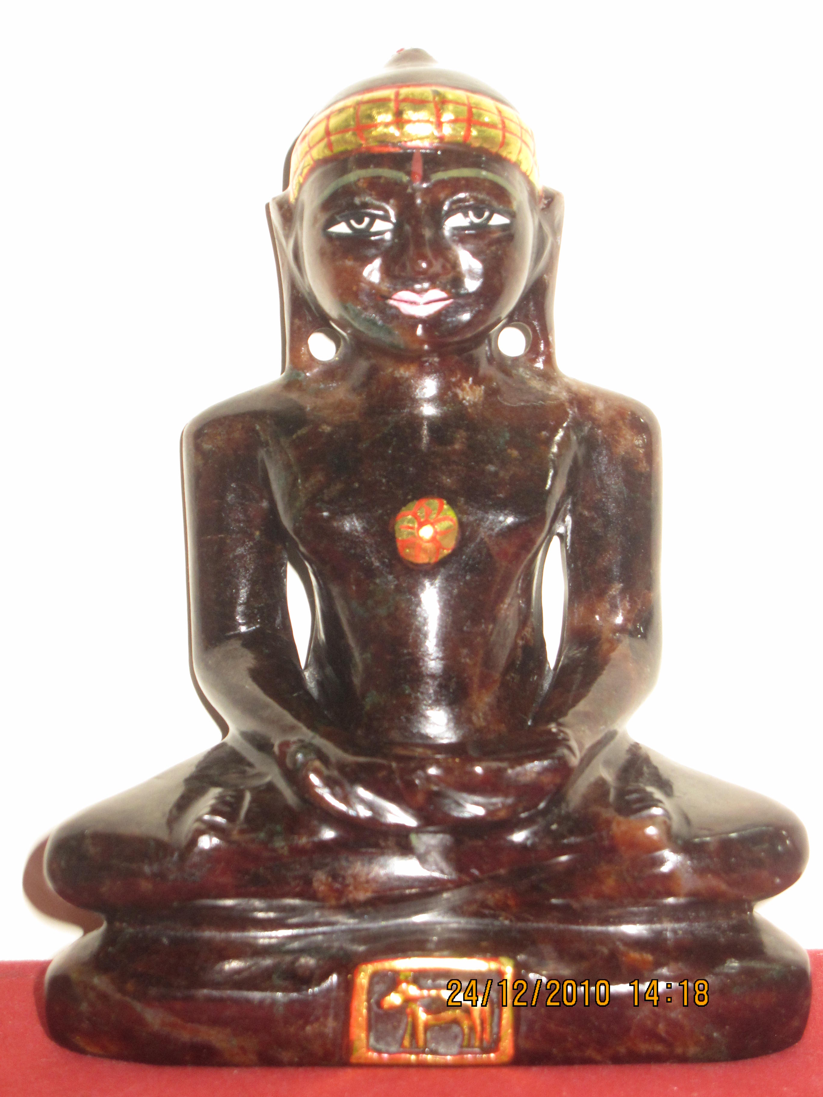 A deep brown pujyaniya Tirthankar statue with calm and serene facial features. The hands are folded in prayer and the deity is seated comfortably in a Padmasan posture.