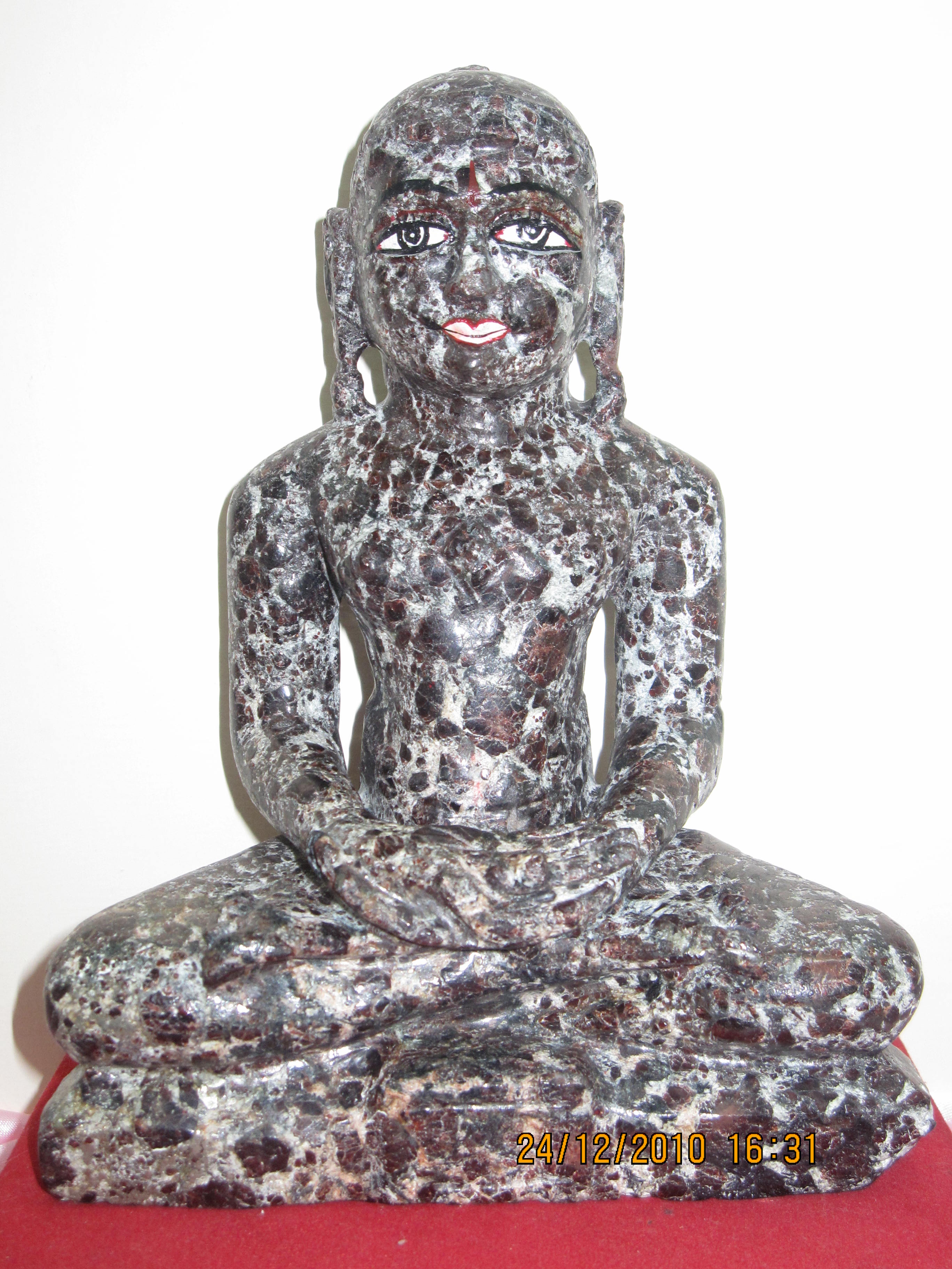 Exceptional texture evident on the charismatic brown and white Tirthankar statue carved out of a classic single piece of rock. Hands and legs folded in deep meditation and the smile contented.