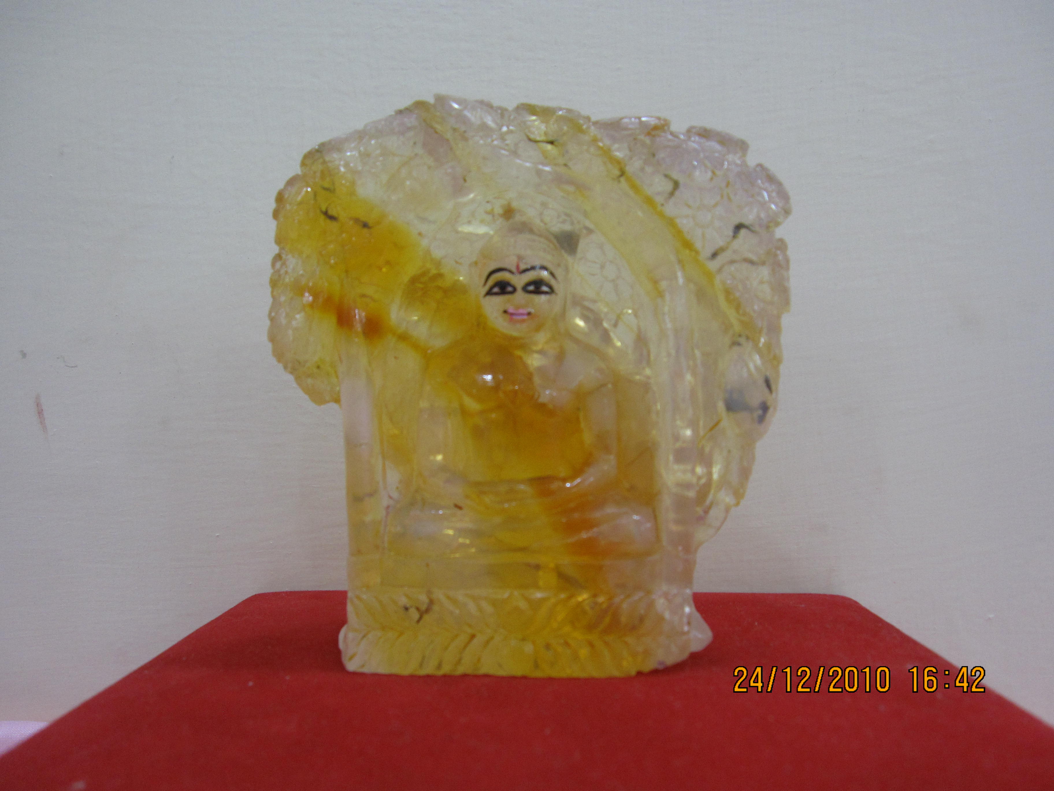 An opal in classic yellow and golden hues transformed into a mesmerizing darshaniya Tirthankar statue. The face is well defined with classic features and a divine smile.