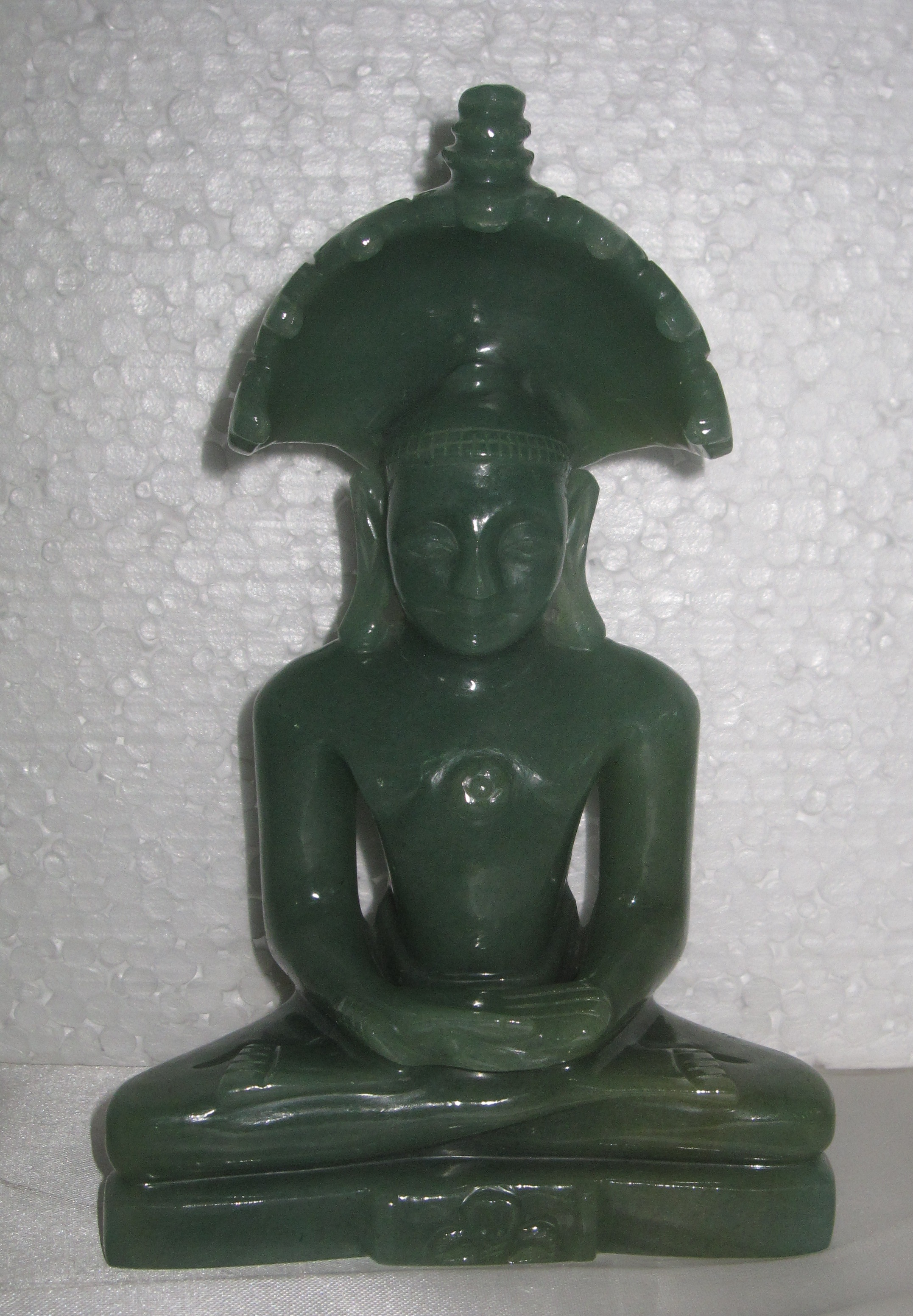 A lively green statue of" Parshwanath swami", with a Chattra on top adding to the aesthetic beauty of the deity. A very well balanced and poised statue indeed.
