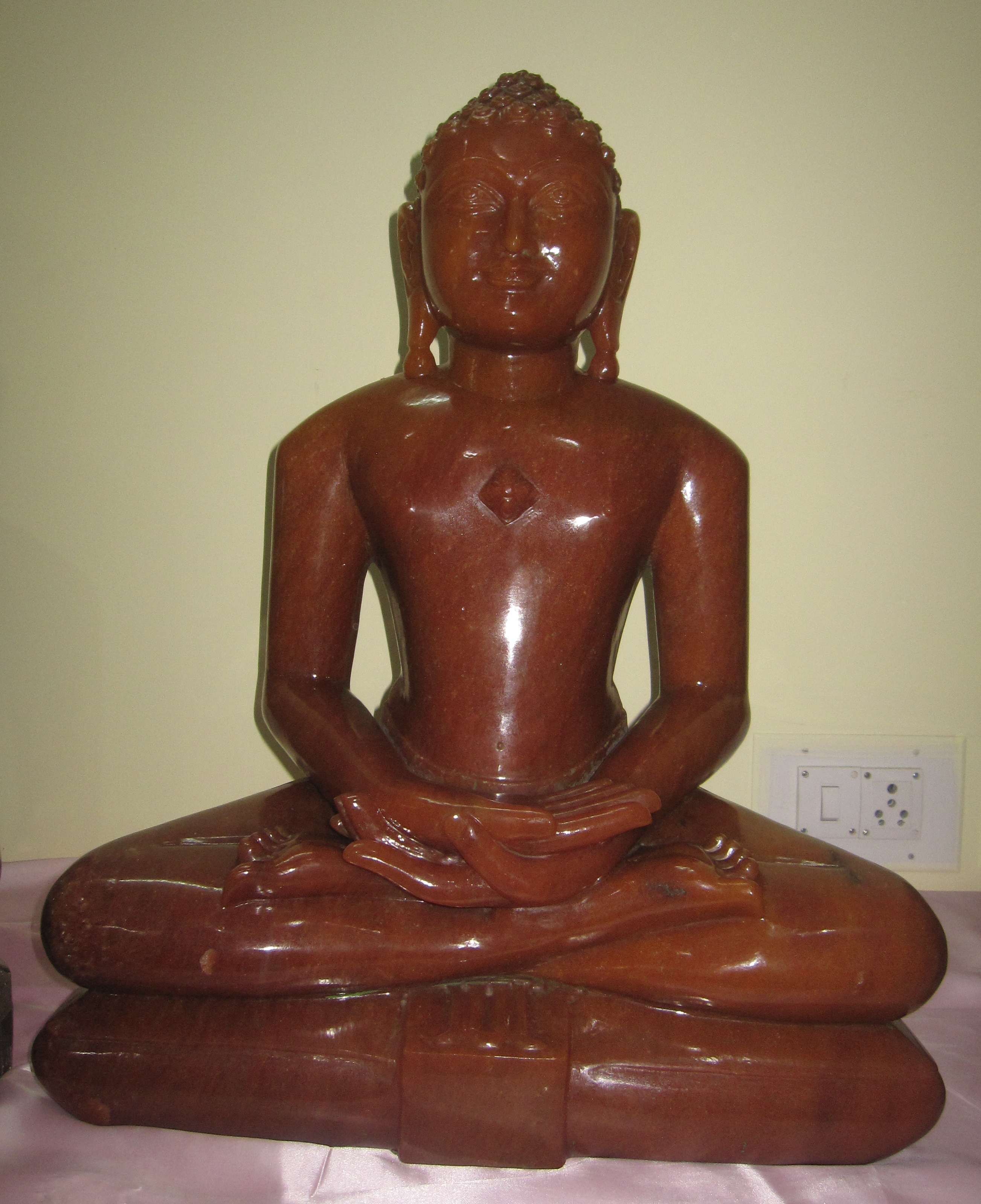 A Classic pujyaniya Tirthankar statue in pretty orange. The hands of the deity are folded deep in prayer and the idol is seated comfortably in Padmasan on a pedestal. A well proportioned statue