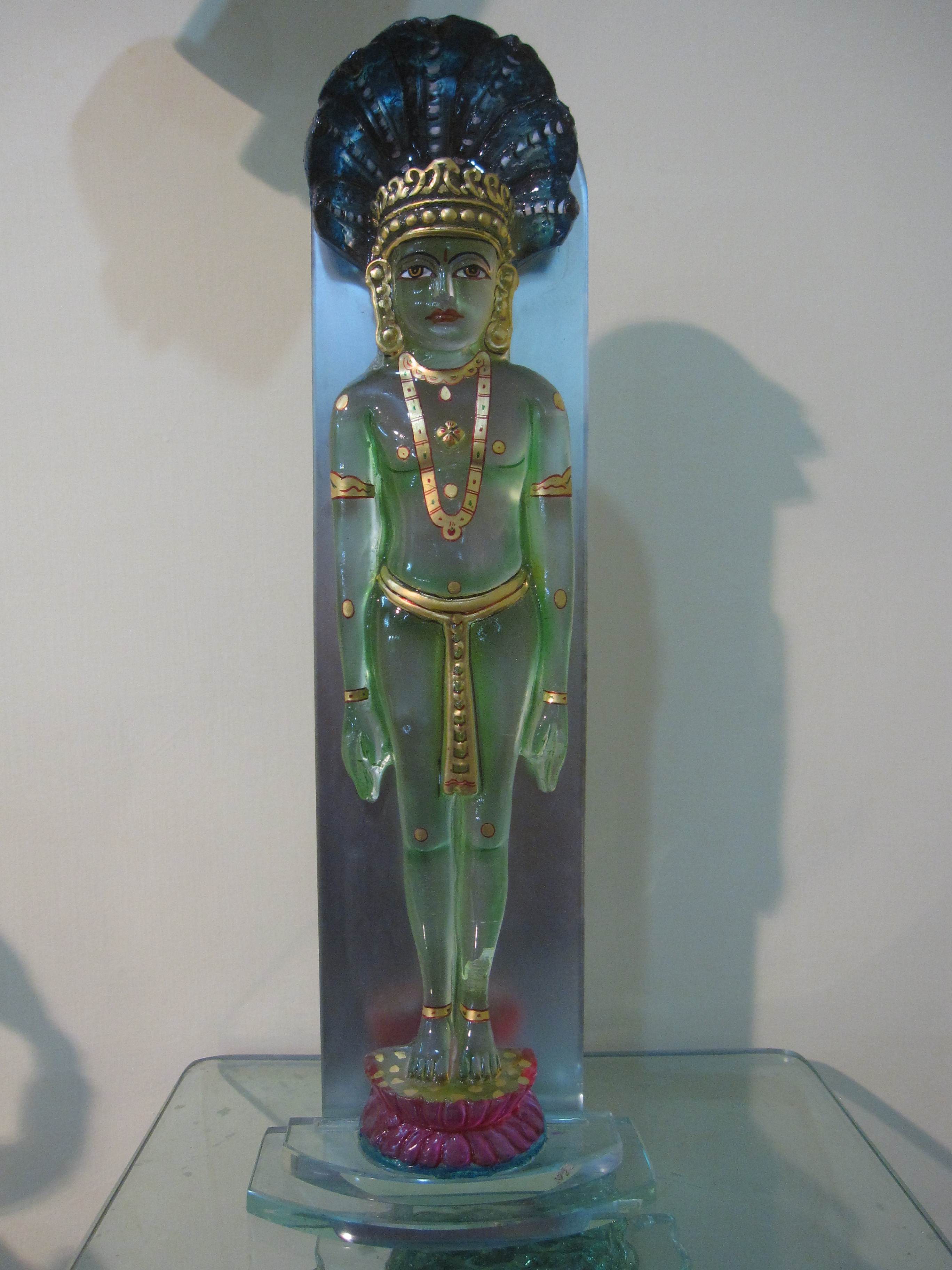 A plastic "Nageshwar" with beautiful golden accented jewels. The face is well distinguished with some highlights in black and red. The double lotus pedestal adds power and divinity to the idol.