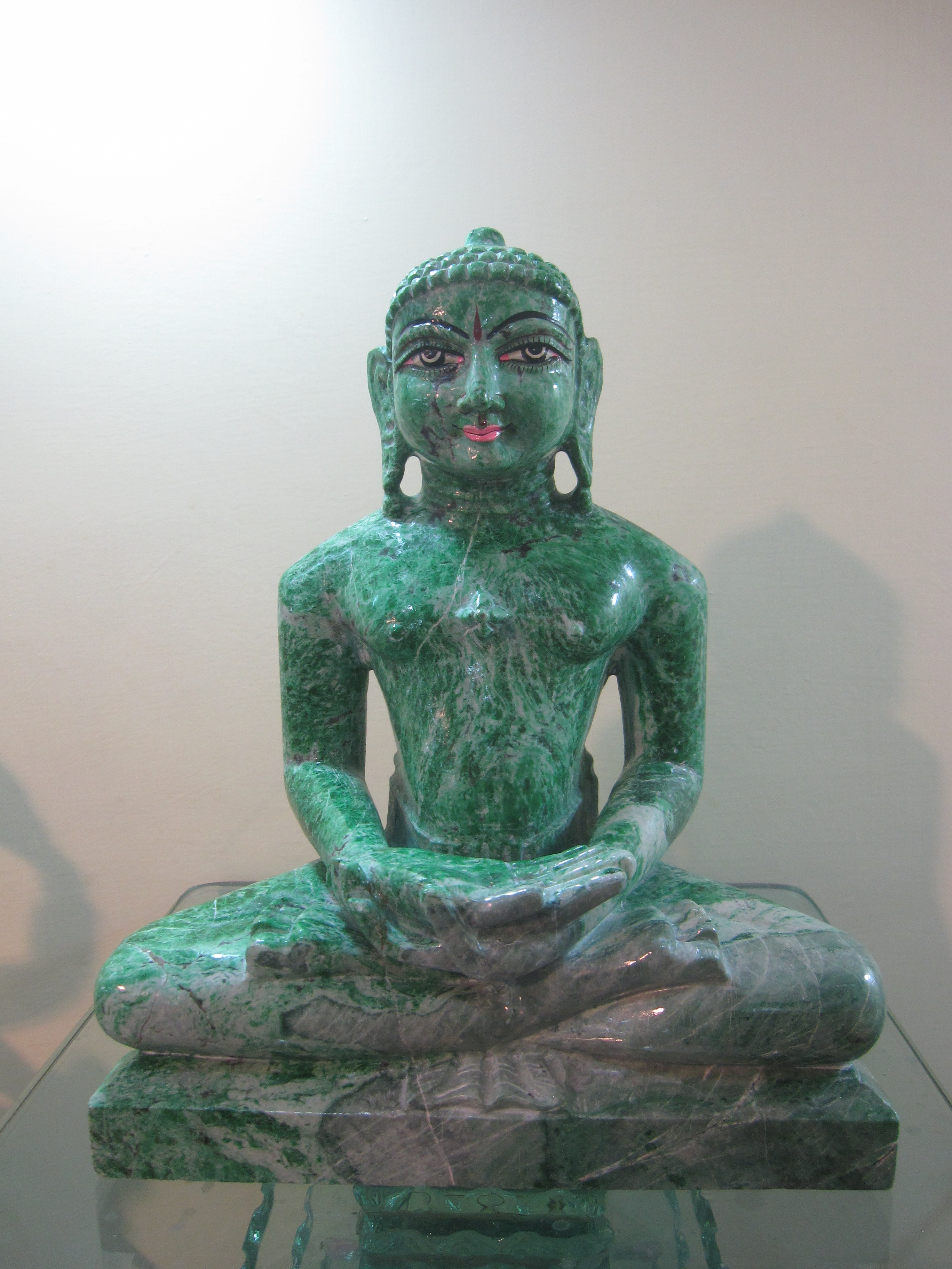 A mysterious statue in green with extremely enigmatic facial expressions. Hands folded in deep prayer and seating posture is a "Padmasan". Classic piece of beauty indeed!