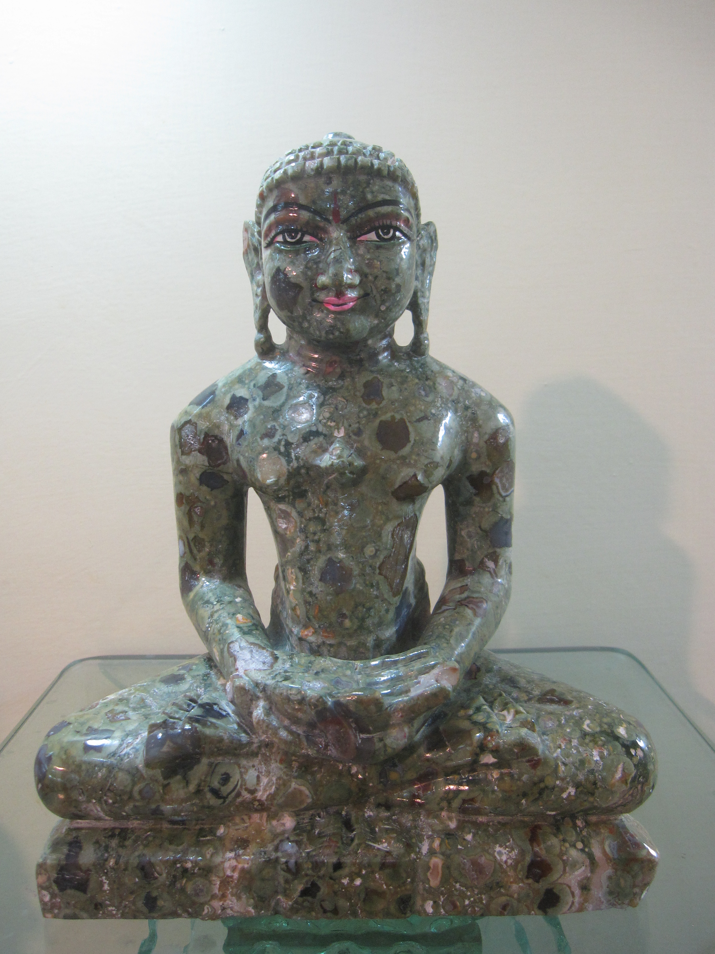 A classic and dotty Tirthankar statue in beautiful earthen hues. The face is well lit and accented with sharp eyes and a mesmerizing smile.
