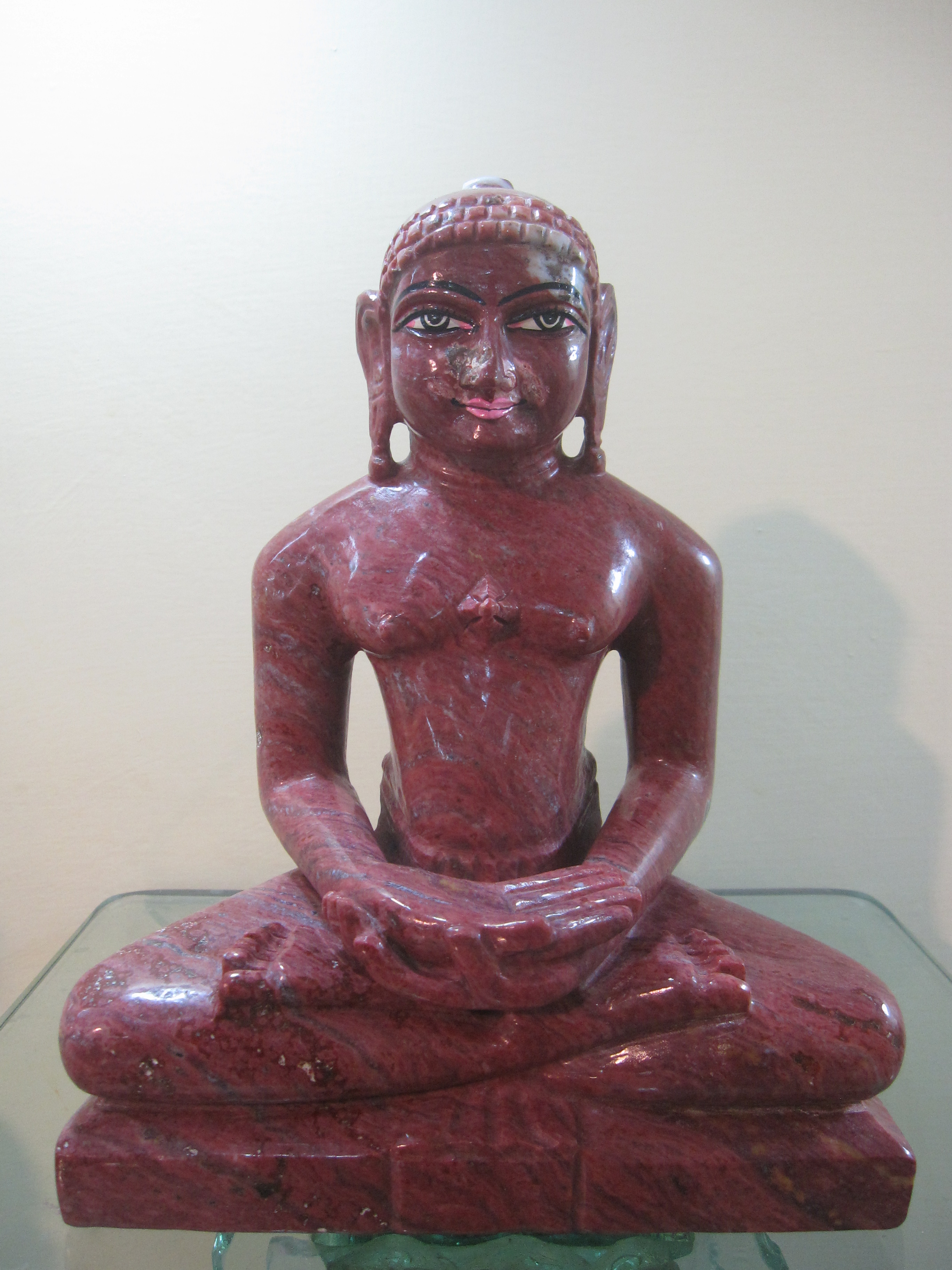 A deep red boulder transformed into a pujyaniya Tirthankar statue. The face is well chiseled with classic aesthetic expressions. A well-proportioned statue indeed!