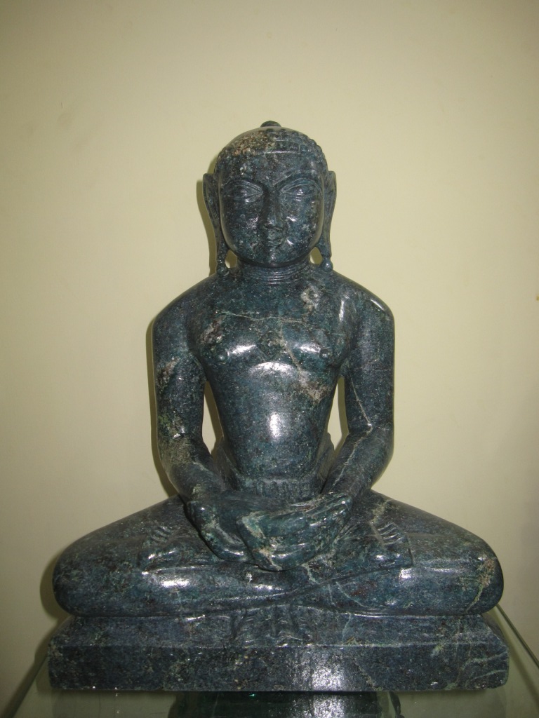 A gorgeous Tirthankar statue in the color of nature…green. Yellow highlighted eyebrows add beauty to the big expressive eyes. The chest and torso are well proportionate to the body.