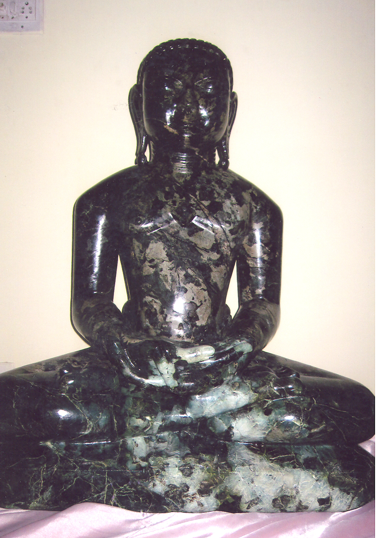 A patchy and dark Tirthankar statue in Pyroxene. Posture is a perfect Padmasan. Facial expressions serene with long elongated ears.