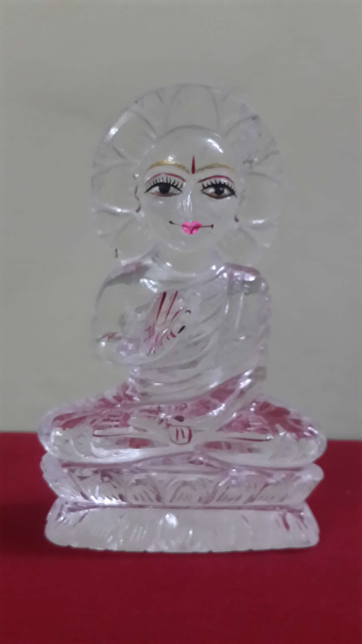 A beautiful statue seated on a double lotus flower. One hand raised and blessing everyone. The sunflower aura around the face adds to the beauty of the already magnificent face.